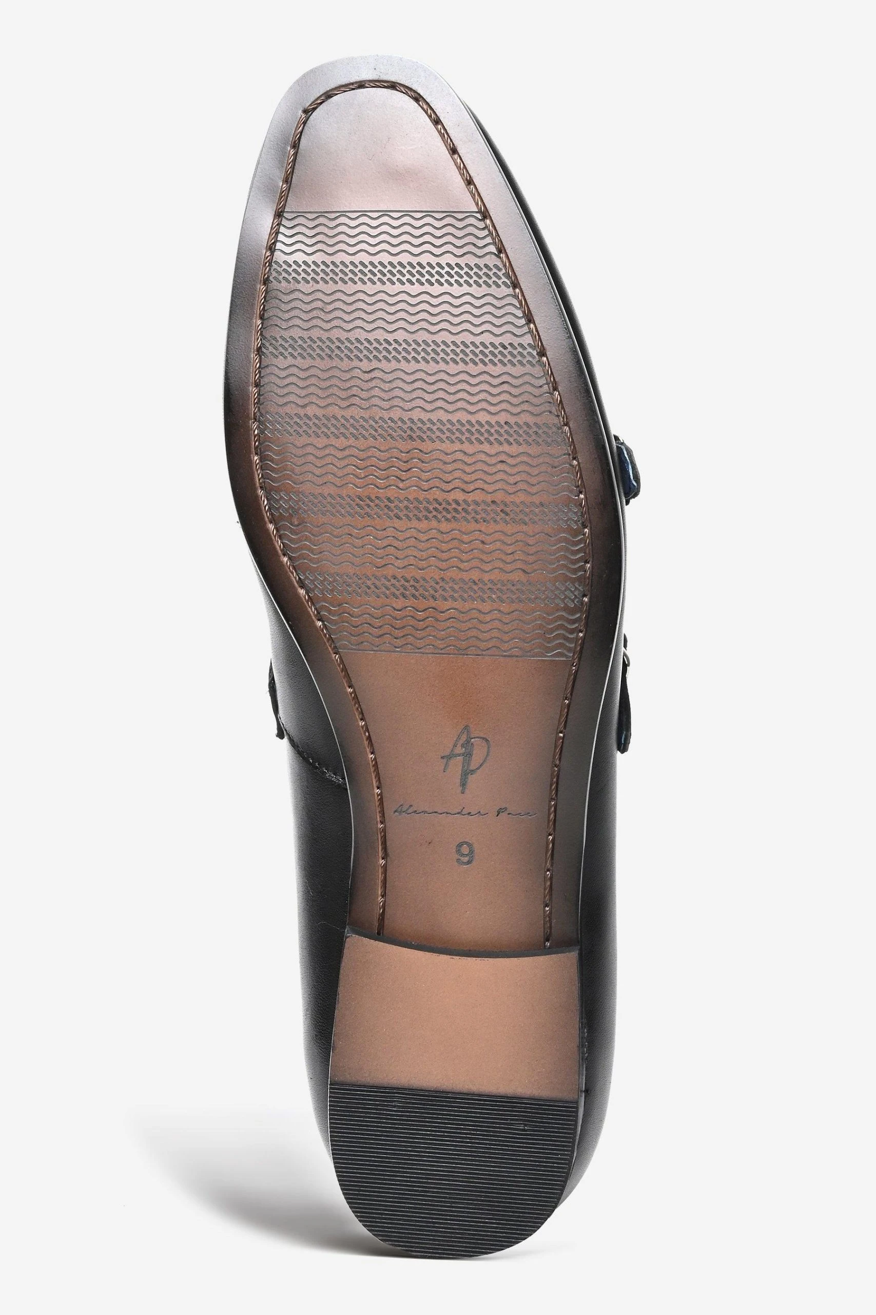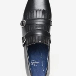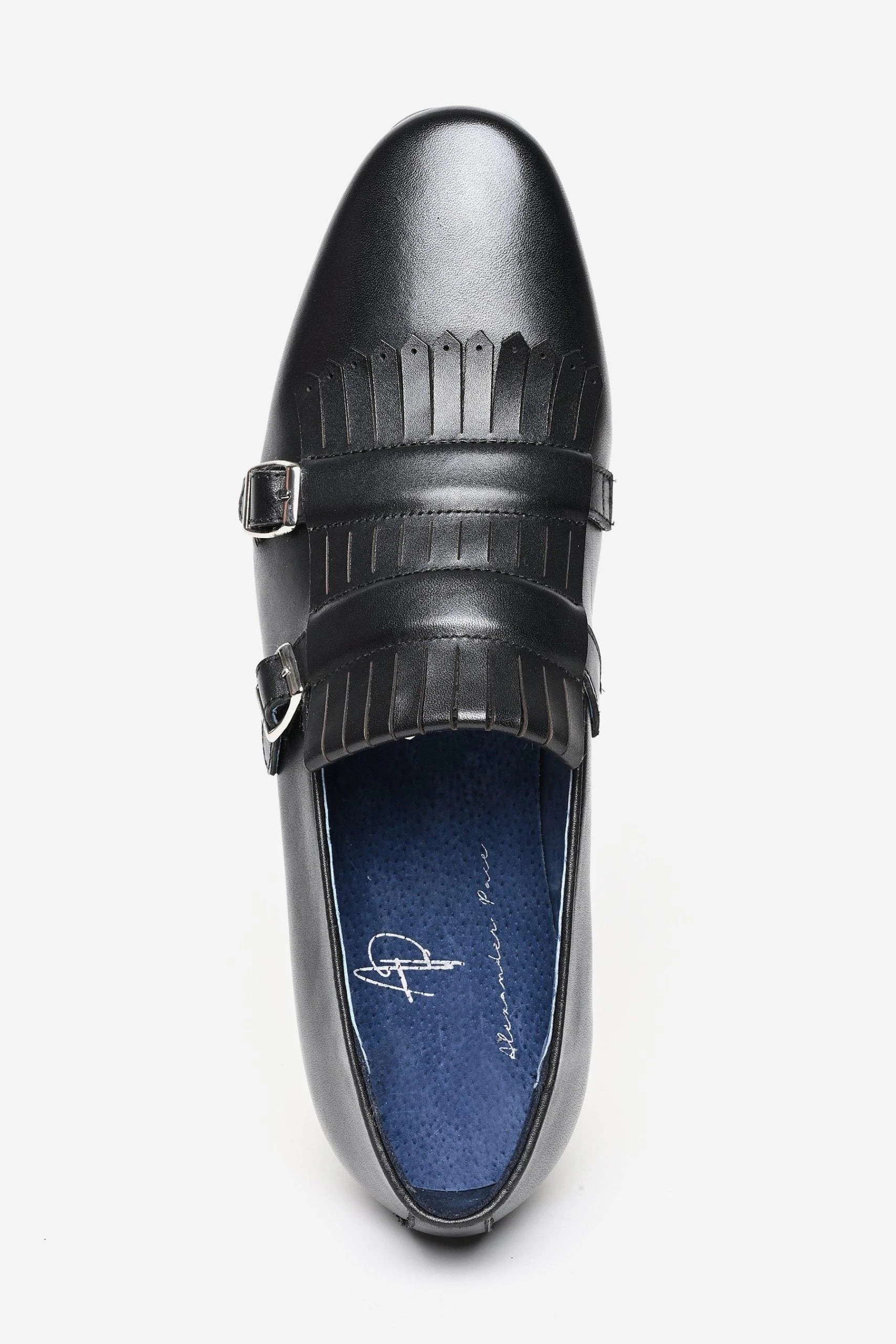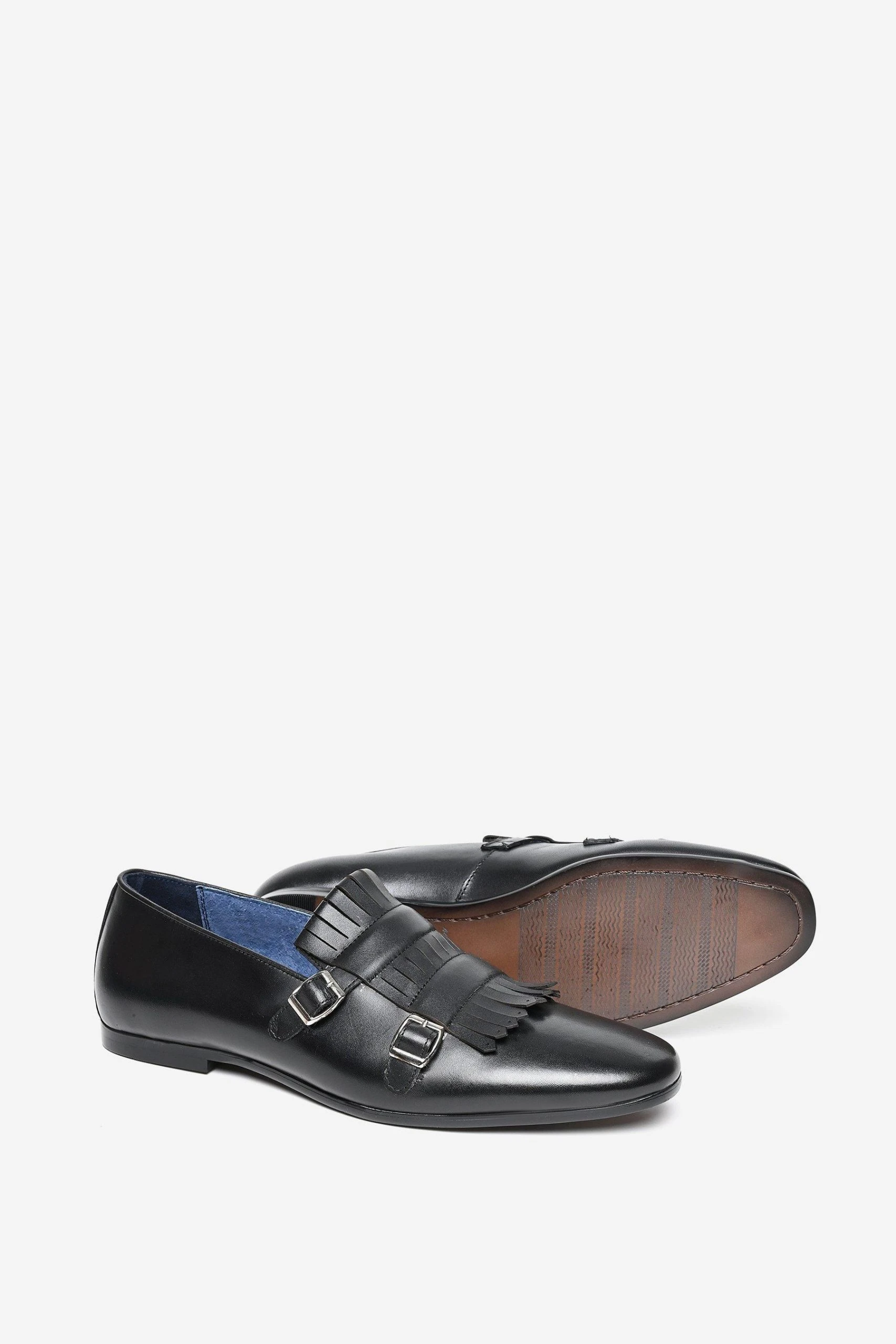 This is a statement shoe. It’s the elegant shoe for the real dapper gentleman. Made in calf Leather, the shoe features a double antique bronze buckle with front fringe. This handsome shoe is available in black and coffee colour.