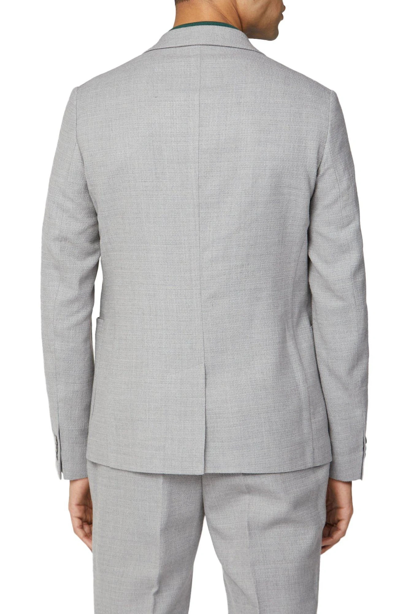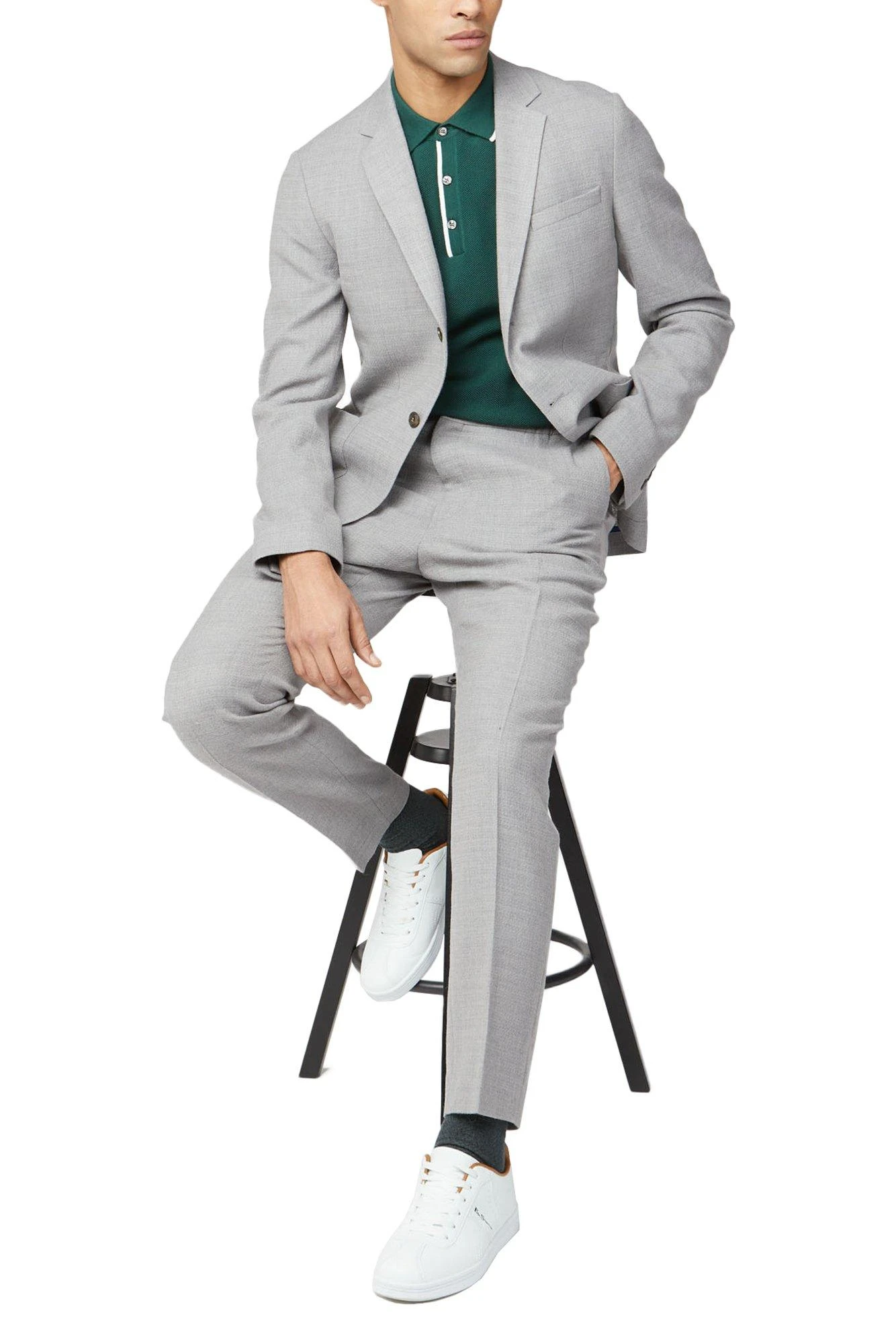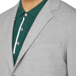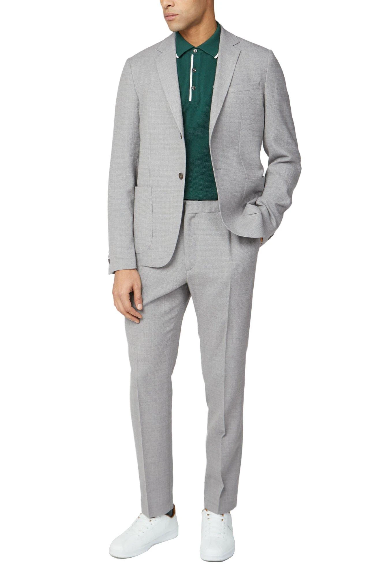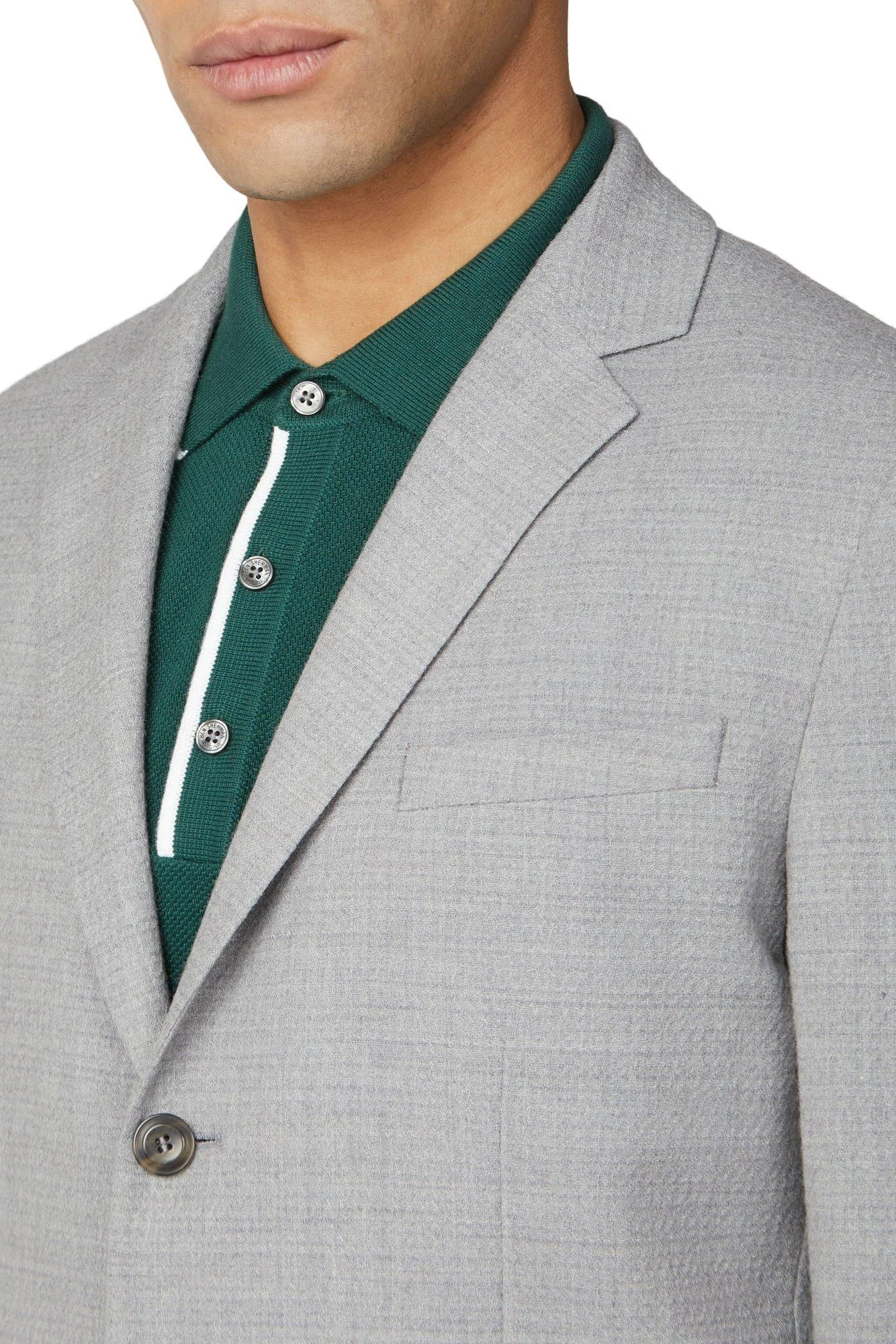 Update your formalwear collection with the ‘Grey Camden fit knit structure suit jacket’ from Ben Sherman. Cool and progressive, Ben Sherman tailoring is adept in smart, refined pieces and casual suiting. With a sharp focus on fit and cut, the modern silhouette has a Camden profile – styled with narrow lapels, sloped shoulder lines and a single vent for a contemporary frame. In a Light grey knit structure, the suit is cut from a wool blend cloth. This classic suit is a transitional piece that will take you from wedding to weekend. Wear smart with a button-down Oxford shirt and black brogues, or casual with grey t-shirt and trainers.