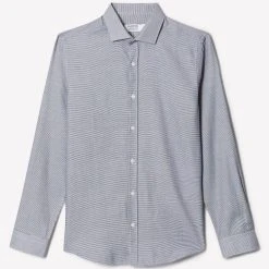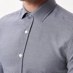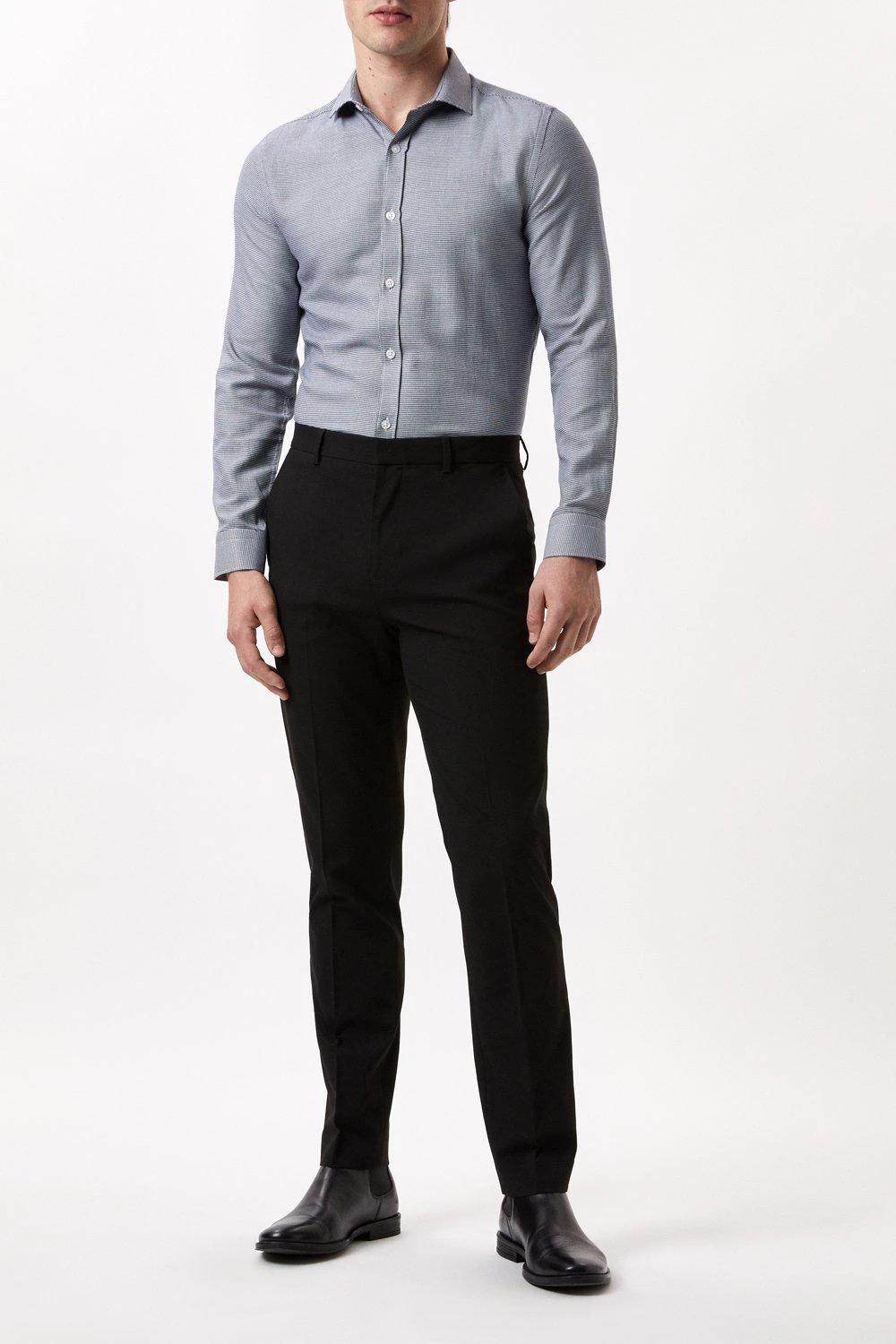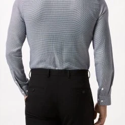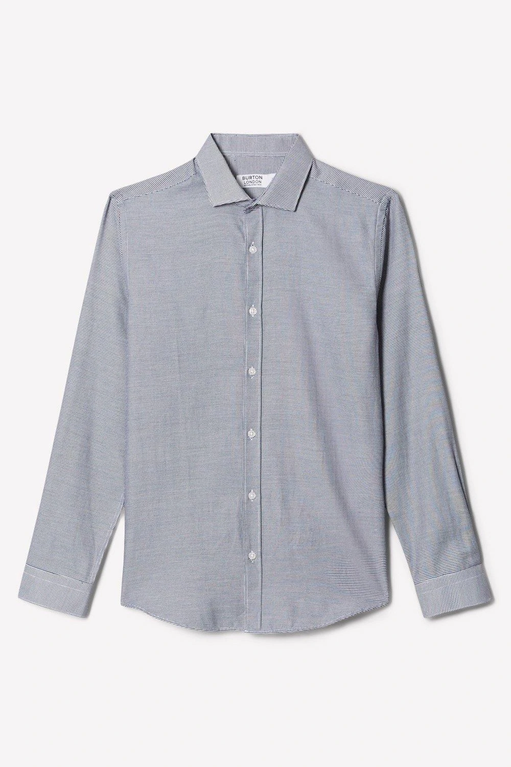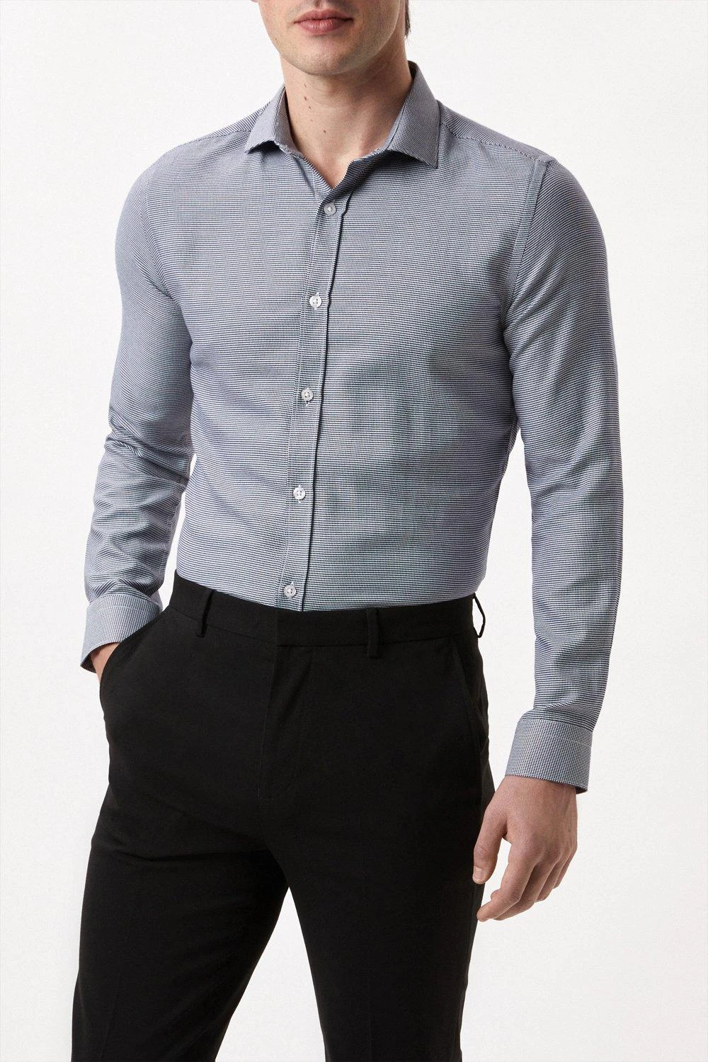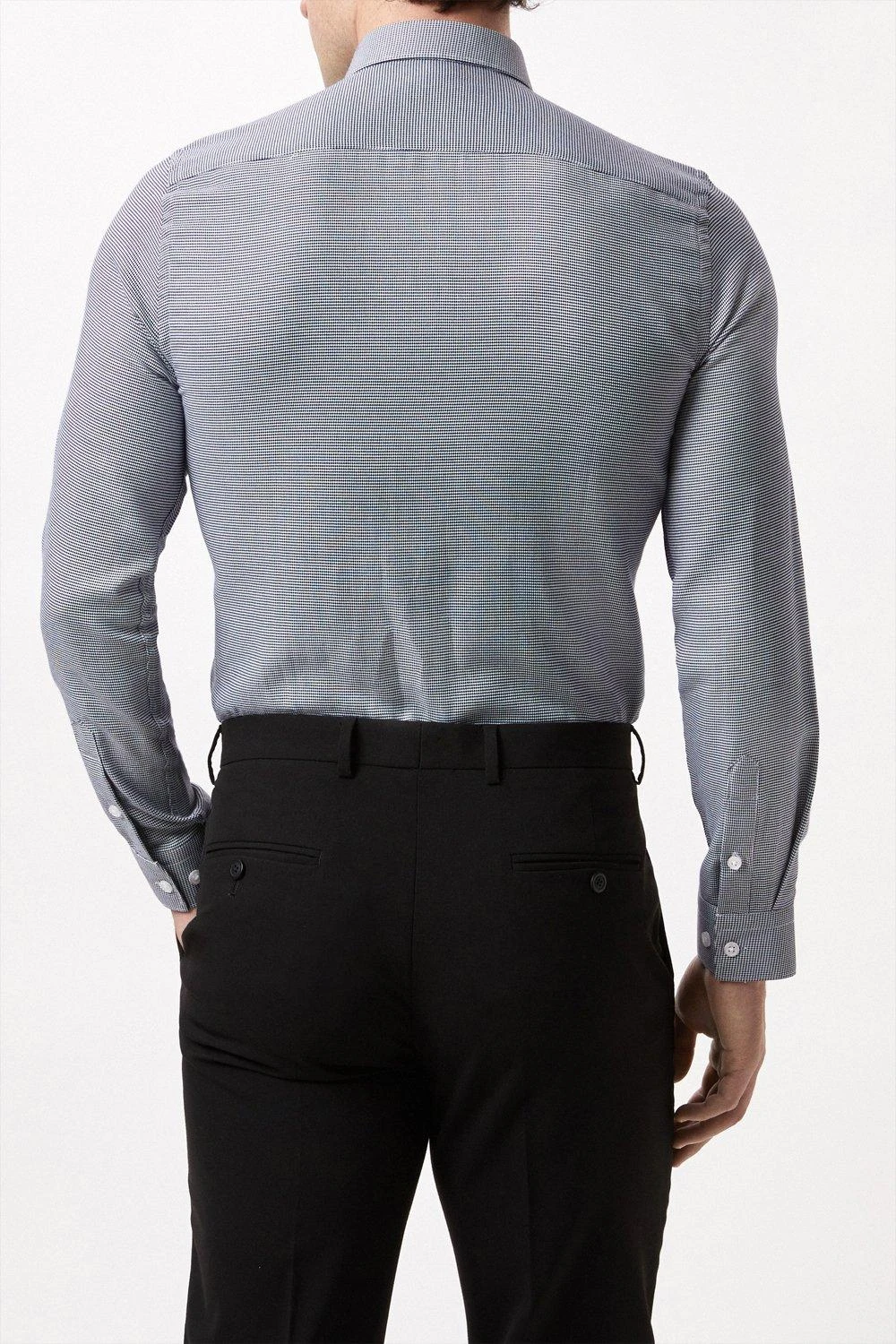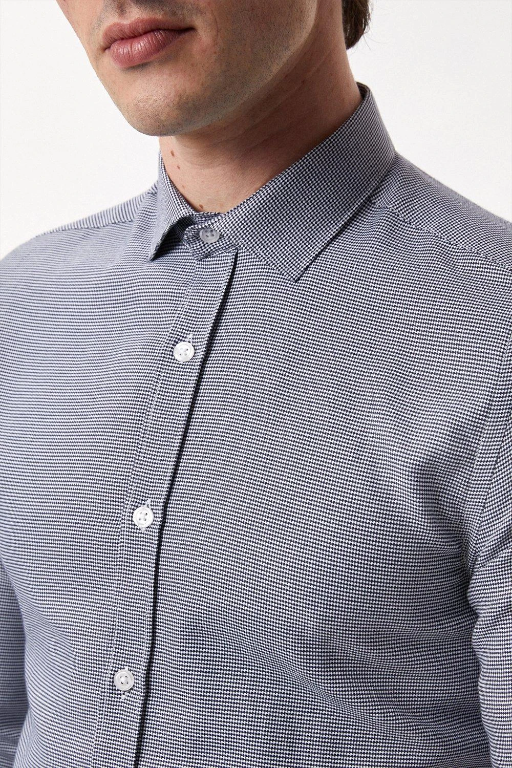 Introducing our new collection of formal fitting shirts, tailored to fit you and available in a range of collar sizes. The slim fit shirt is designed to create definition with a tapered waist, slim silhouette, and curved hem, pairing perfectly with our timeless tailoring. Crafted from a rich cotton blend fabric, it features a classic point collar, single cuff and is finished with dyed- to-match pearl buttons.Style: Long Sleeve Slim Navy Puppytooth Point Collar ShirtLength: Approx. 76cmFit: SlimIdeal for: SmartDesign: Collar