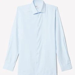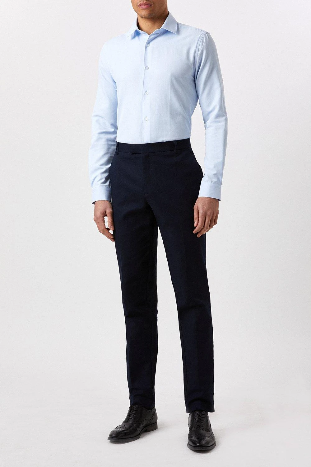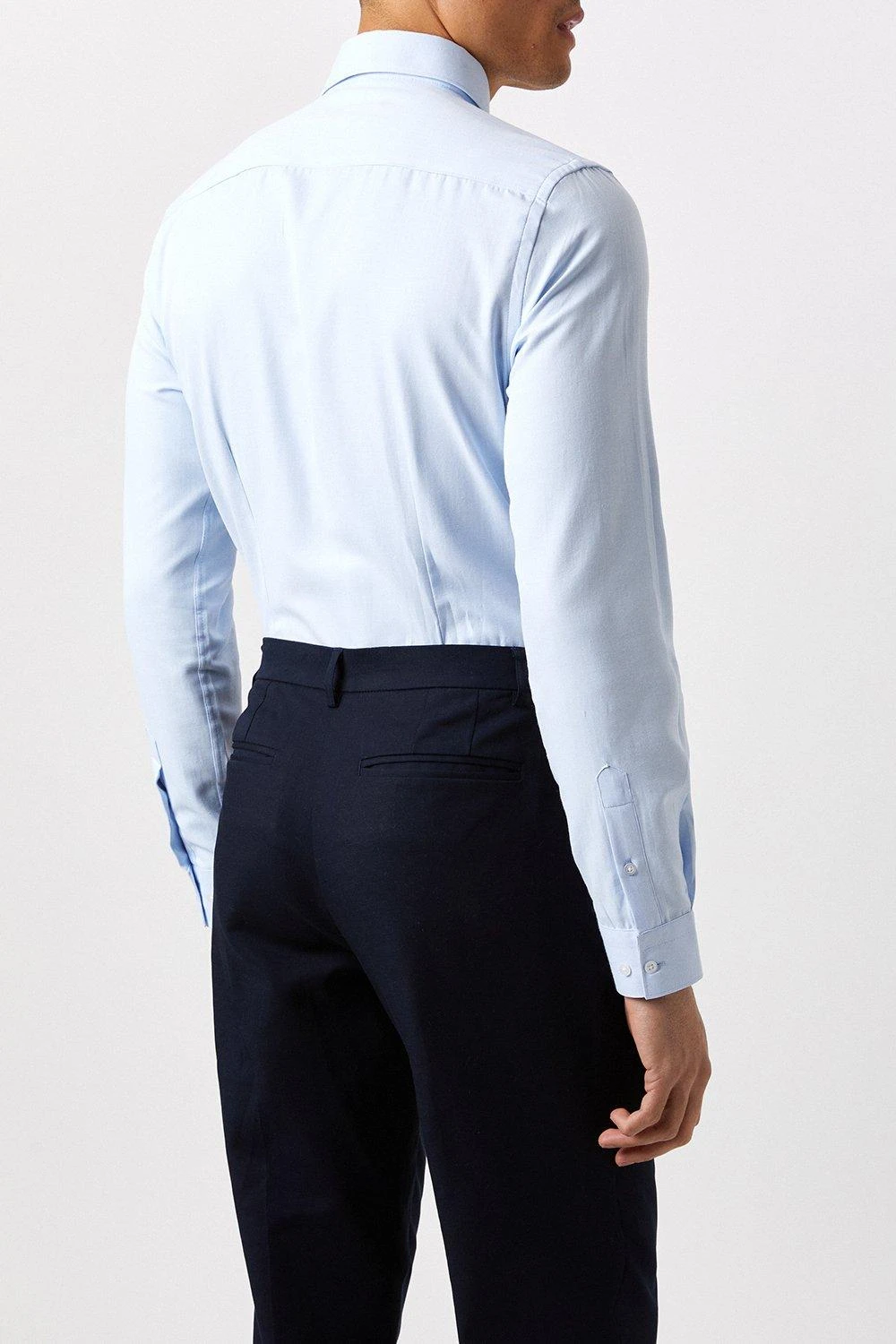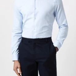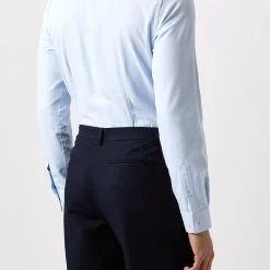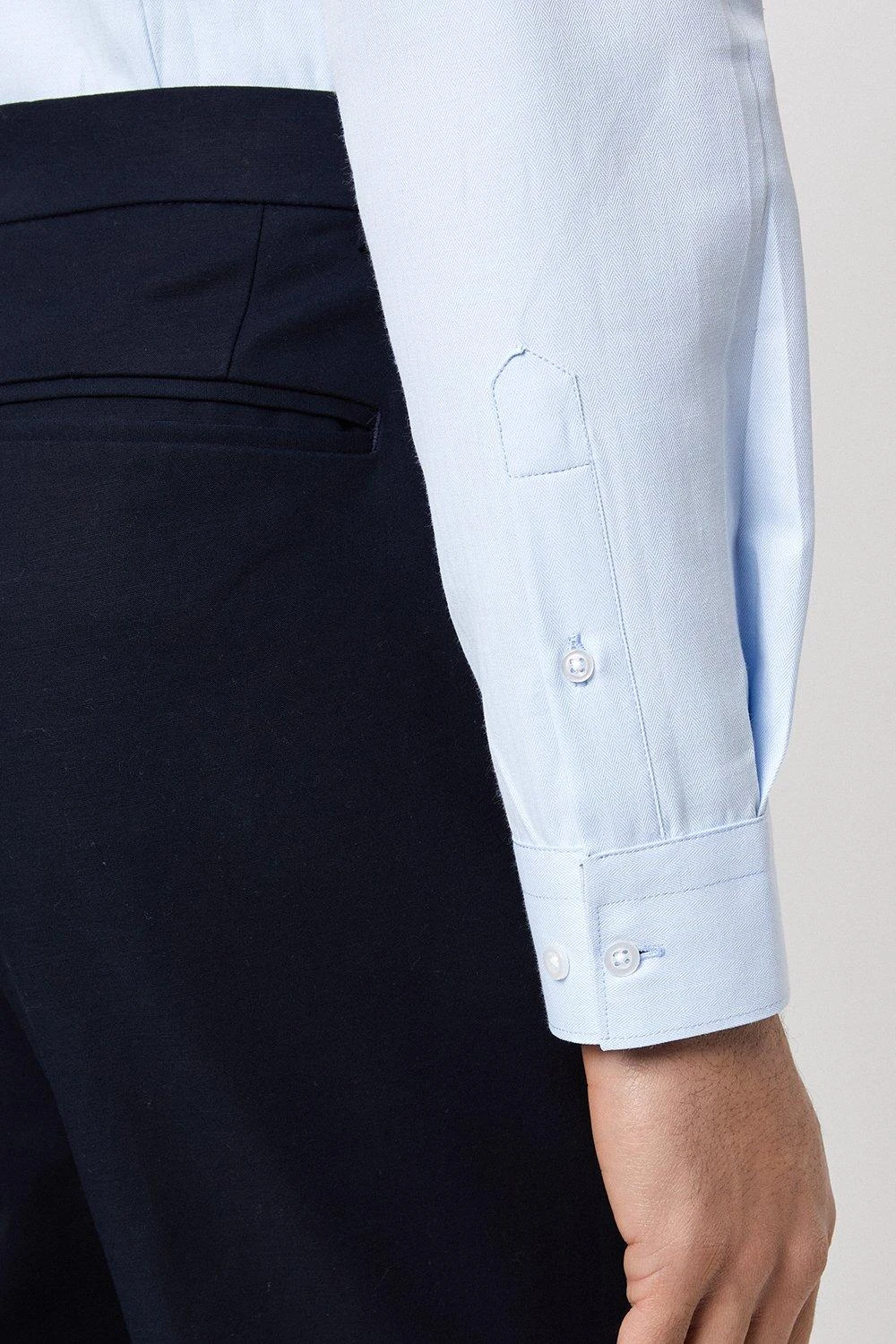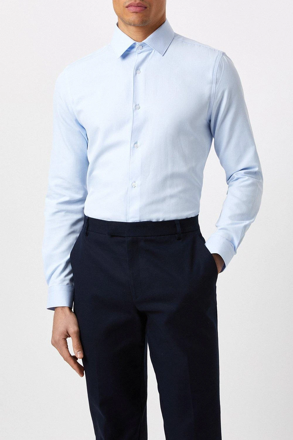Introducing our new collection of formal fitting shirts, tailored to fit you and available in a range of collar sizes. The slim fit shirt is designed to create definition with a tapered waist, slim silhouette, and curved hem, pairing perfectly with our timeless tailoring. Crafted from a rich cotton blend fabric, it features a classic point collar, single cuff and is finished with dyed- to-match pearl buttons.
