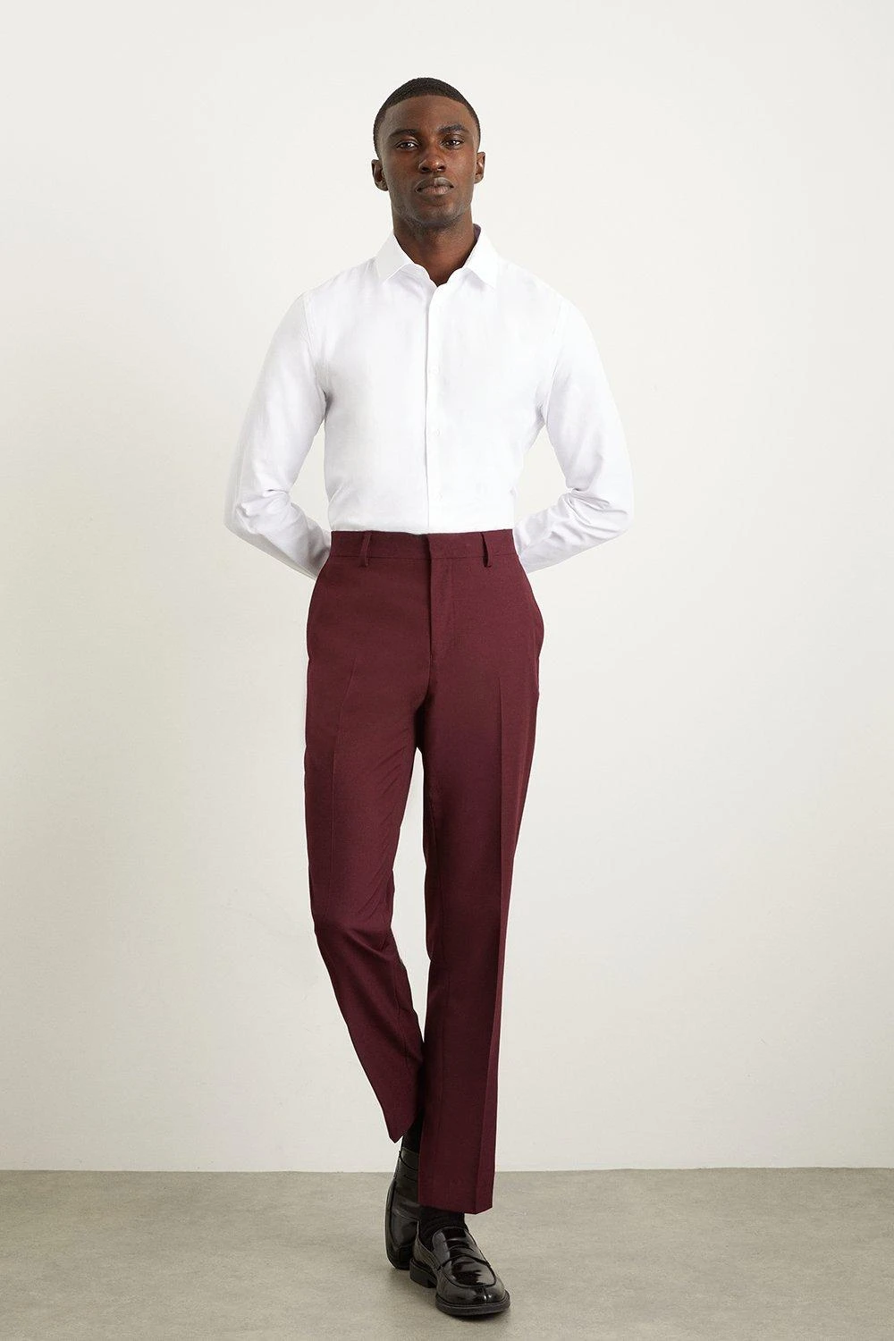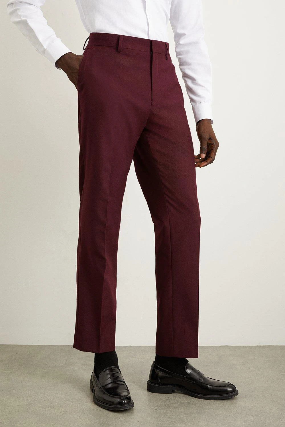 Established back in 1904, we’ve been providing you with great British style and timeless tailoring ever since. Featuring single and double breasted styles as well as classic and modern fits and patterns, our collection of mens suits will keep you on-trend with sharp tailoring, from season to season. Whether you’re suiting up for important meetings or you’ve got a special occasion coming up, we’ve got you sorted. Style: Skinny Fit Burgundy Suit Trousers. Ideal for: Smart. Fit: Skinny. Design: Single Button. Model wears size UK 10 and is 5′ 9″ tall.