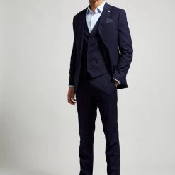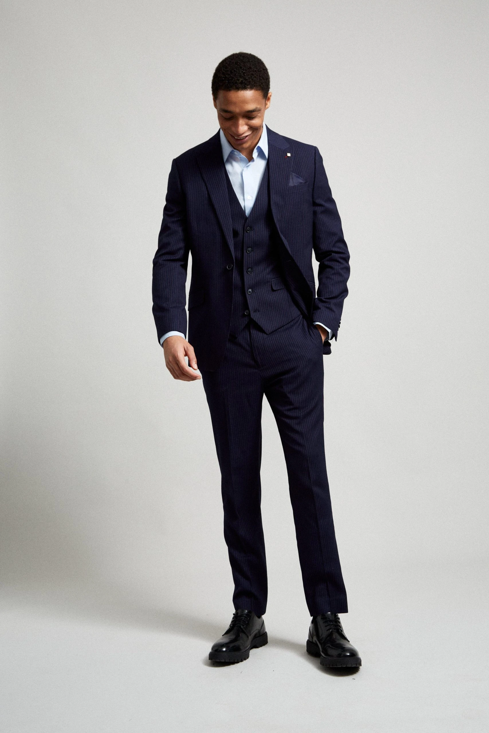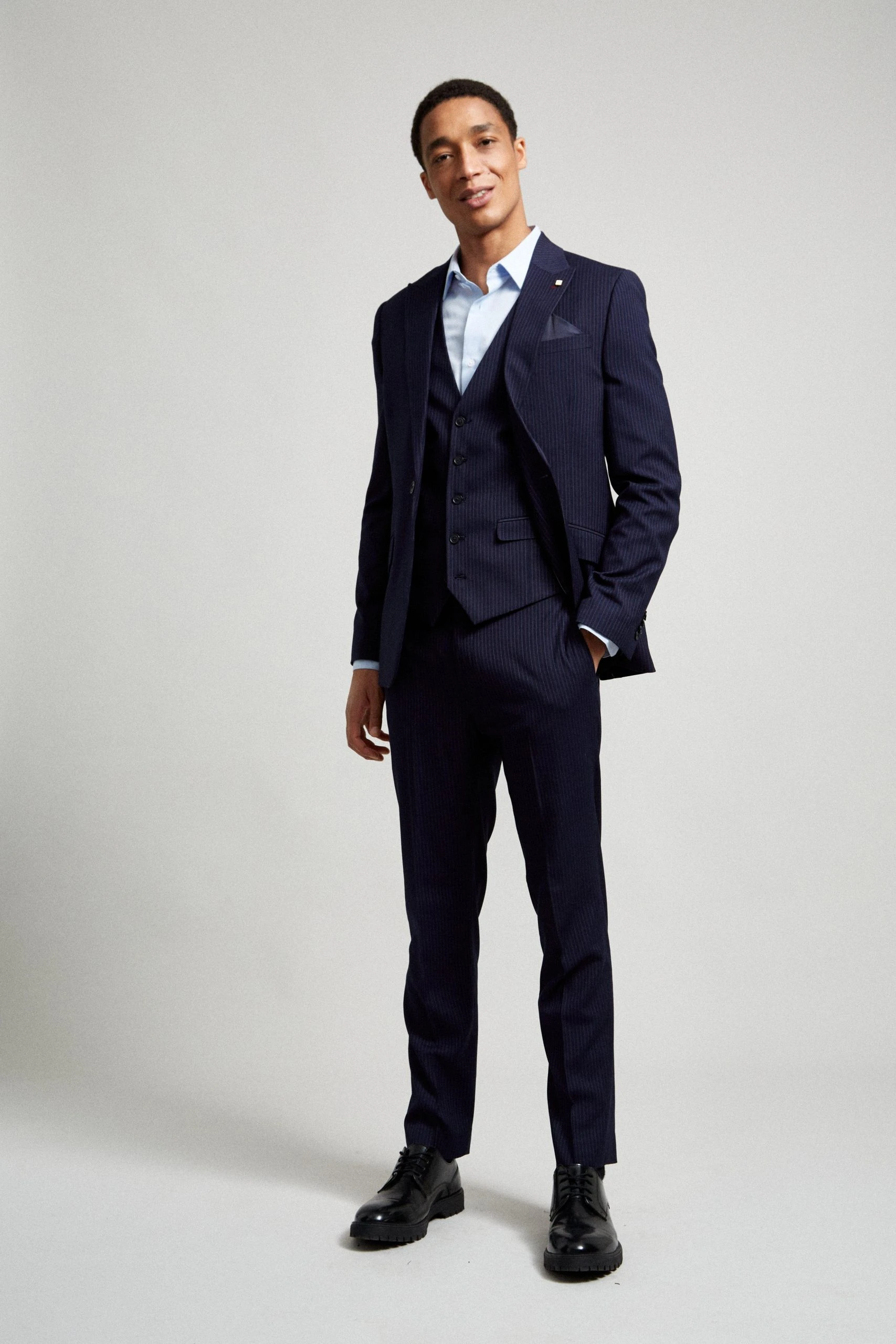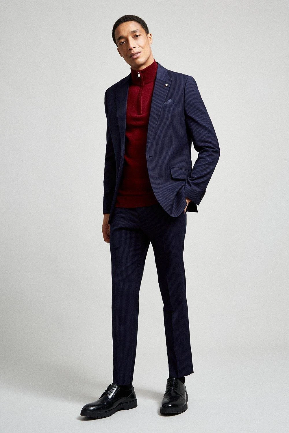 Part of our main range of suits, this suit blazer comes in a navy and red stripe design and a perfect skinny fit. Featuring peak lapels, front pockets and back vents. Model is 6 foot 1 and is wearing size 40R. Main fabric: 70% Polyester 28% Viscose 2%Elastane