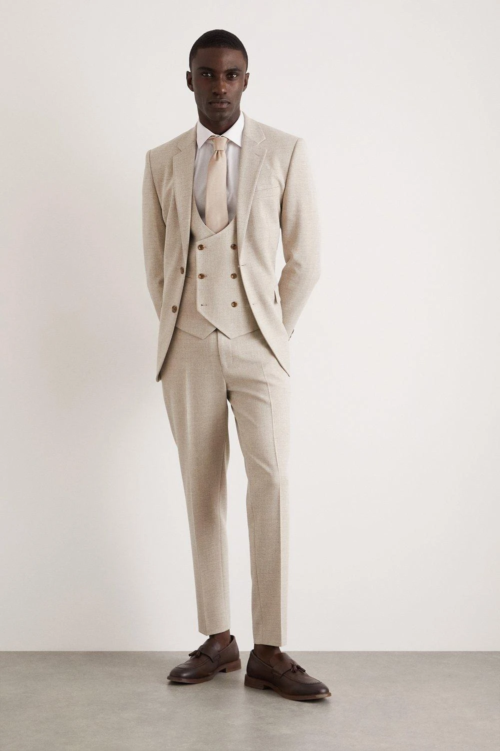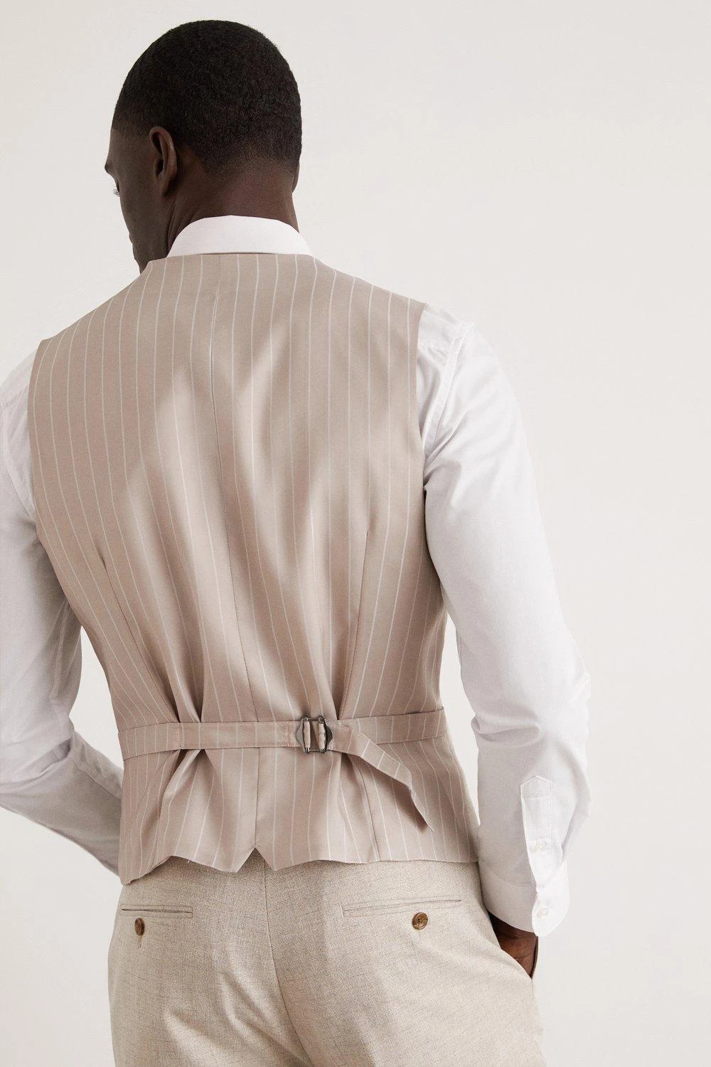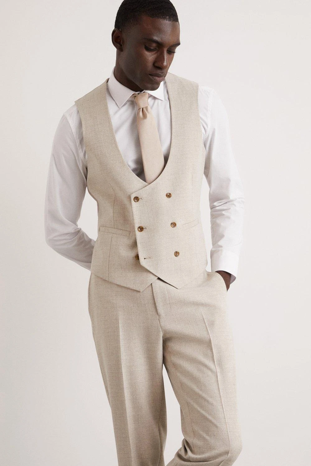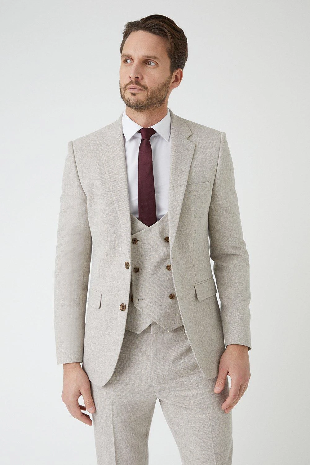 Established back in 1904, we’ve been providing you with great British style and timeless tailoring ever since. Featuring single and double breasted styles as well as classic and modern fits and patterns, our collection of mens suits will keep you on-trend with sharp tailoring, from season to season. Whether you’re suiting up for important meetings or you’ve got a special occasion coming up, we’ve got you sorted. Style: Skinny Fit Neutral Semi Plain Waistcoat. Ideal for: Smart. Fit: Skinny. Design: Single Button. Model wears size UK 10 and is 5′ 9″ tall.