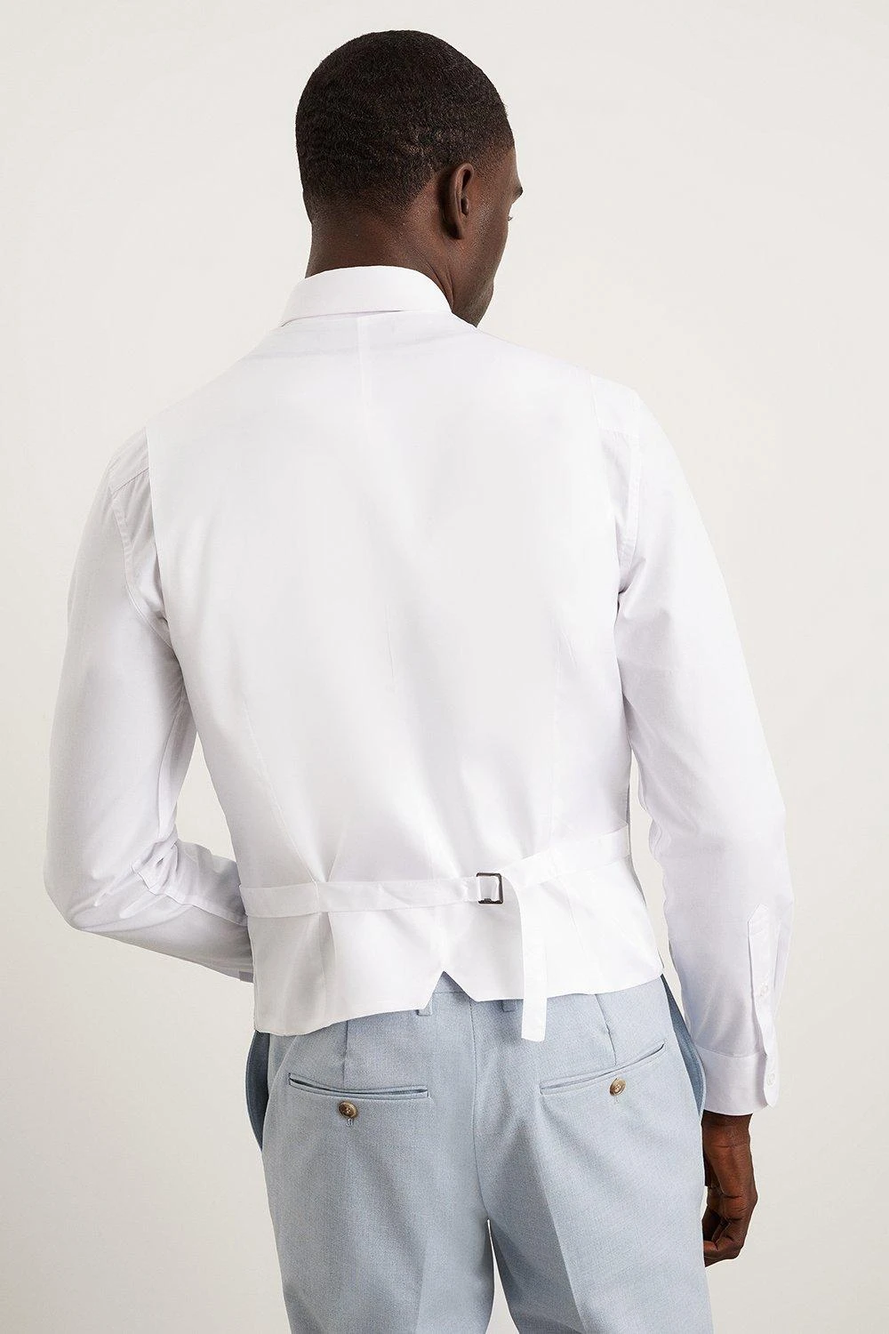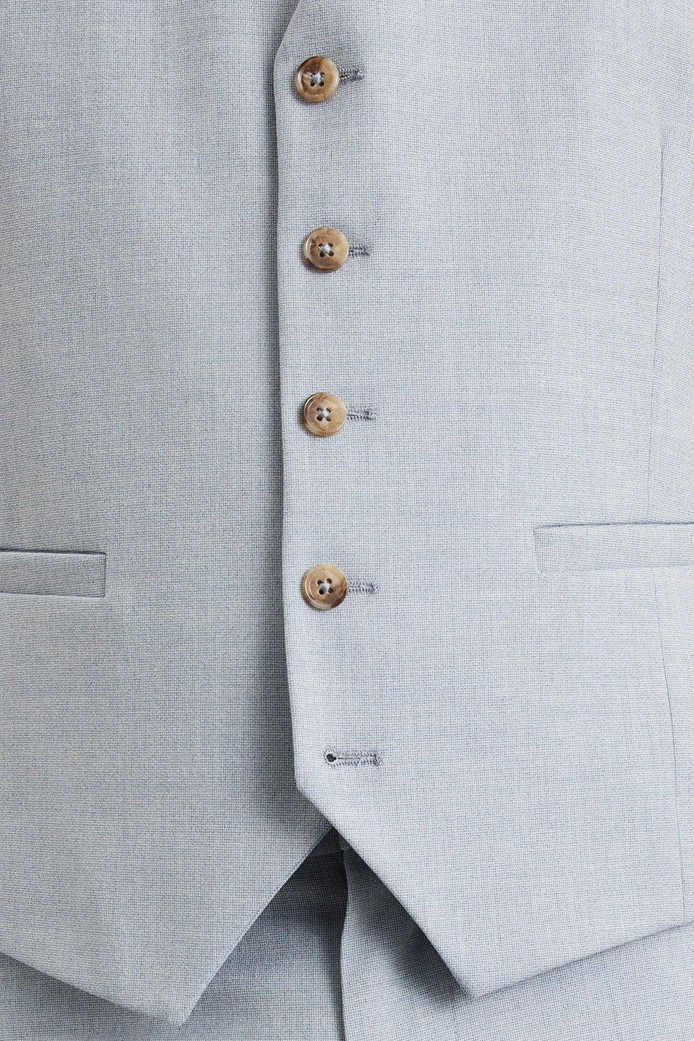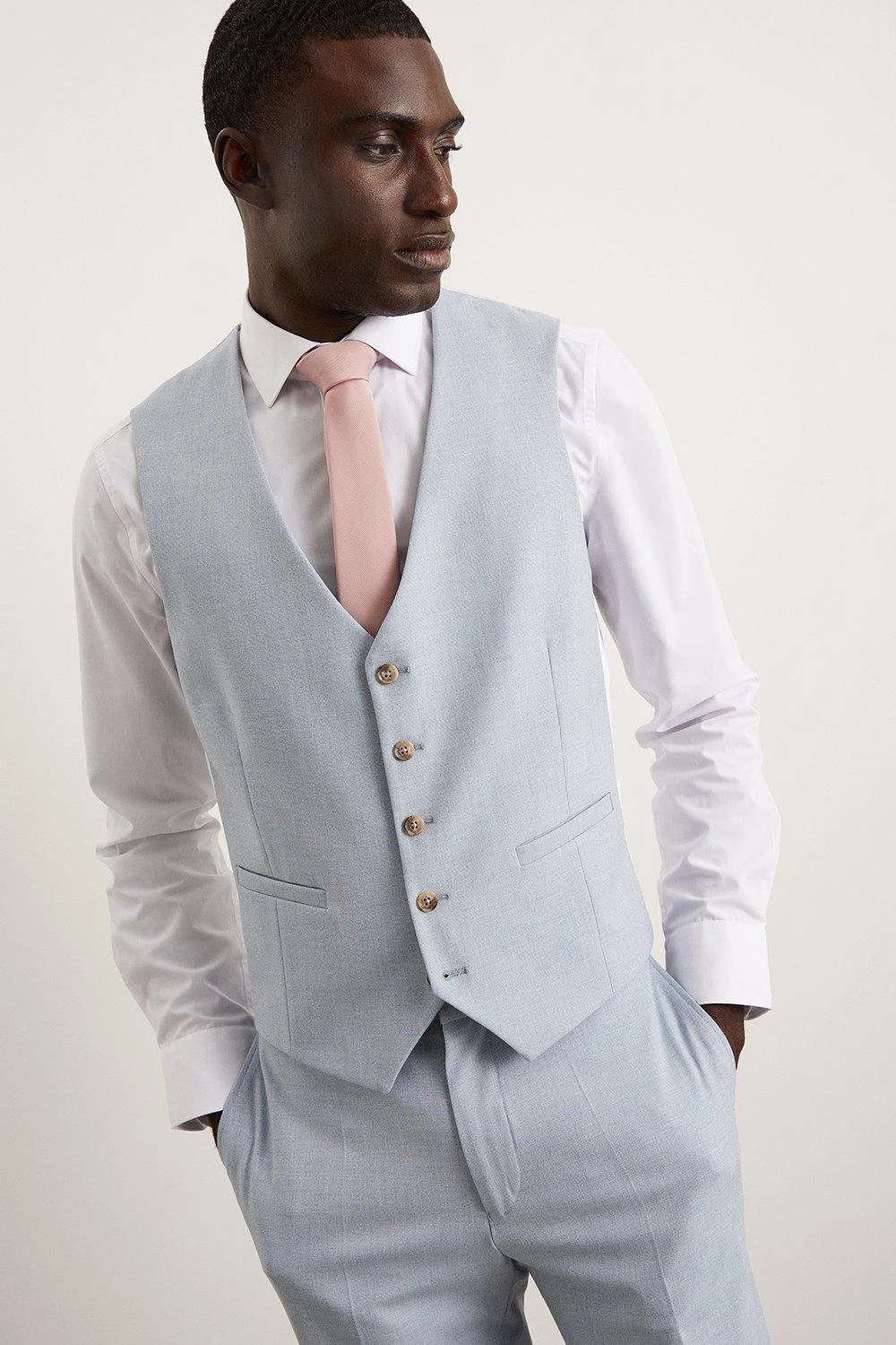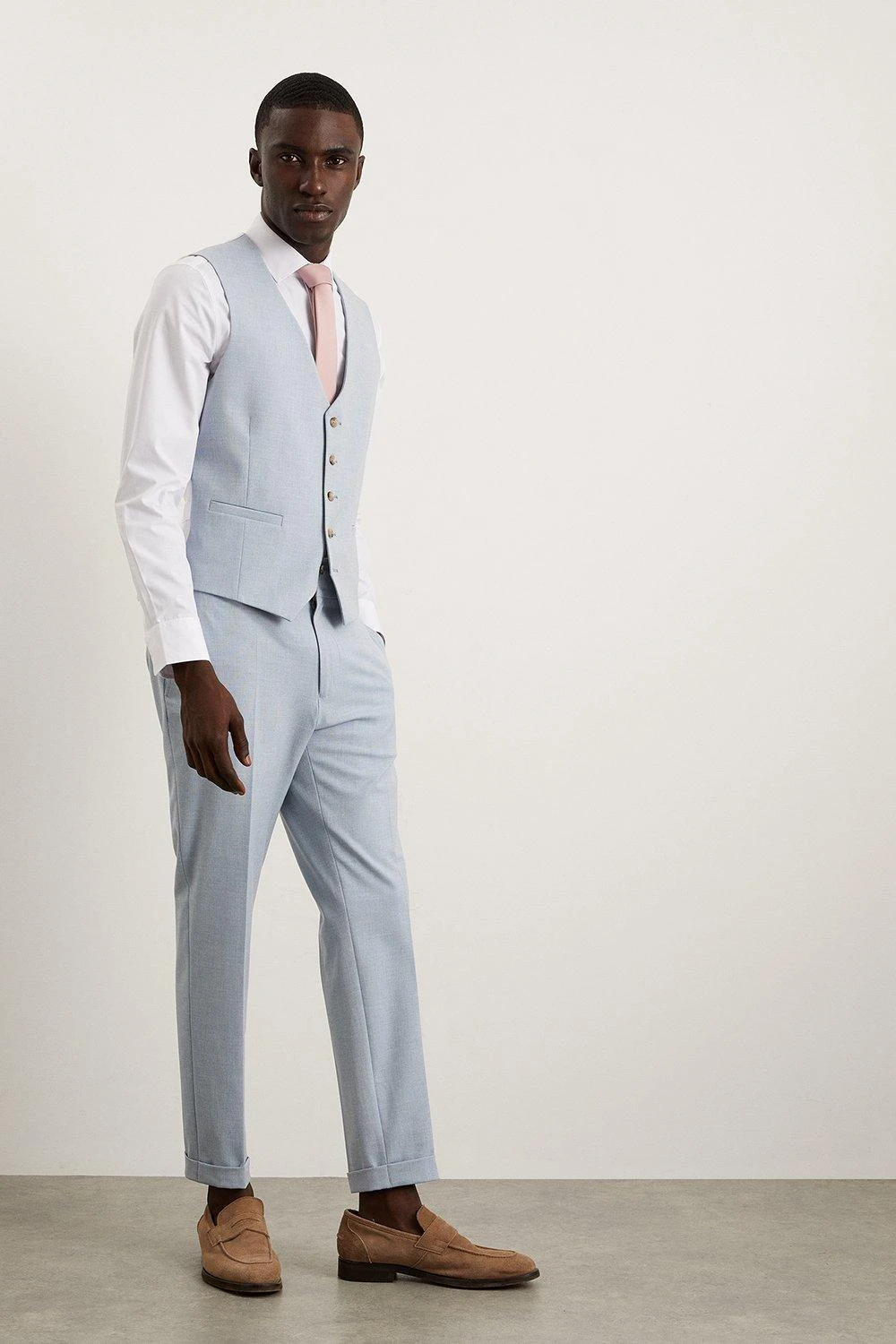 Established back in 1904, we’ve been providing you with great British style and timeless tailoring ever since. Featuring single and double breasted styles as well as classic and modern fits and patterns, our collection of mens suits will keep you on-trend with sharp tailoring, from season to season. Whether you’re suiting up for important meetings or you’ve got a special occasion coming up, we’ve got you sorted. Style: Skinny Fit Pale Blue End On End Waistcoat. Ideal for: Smart. Fit: Skinny. Design: Single Button. Model wears size UK 10 and is 5′ 9″ tall.