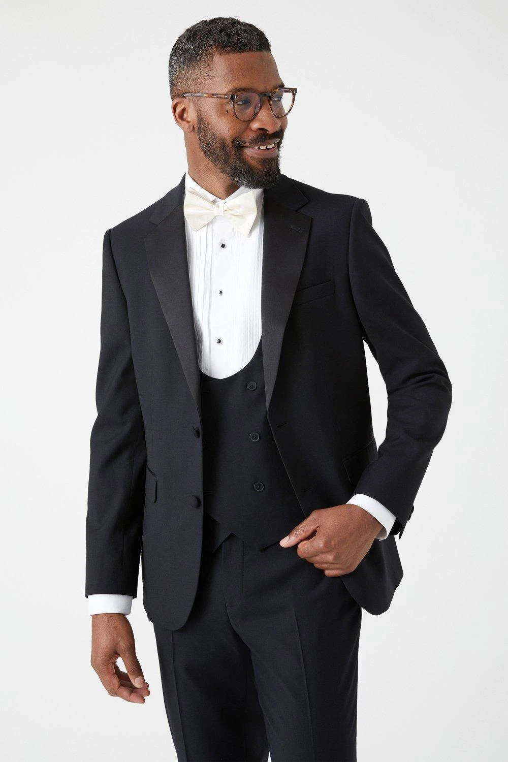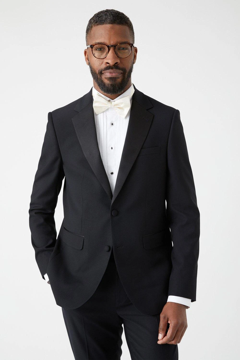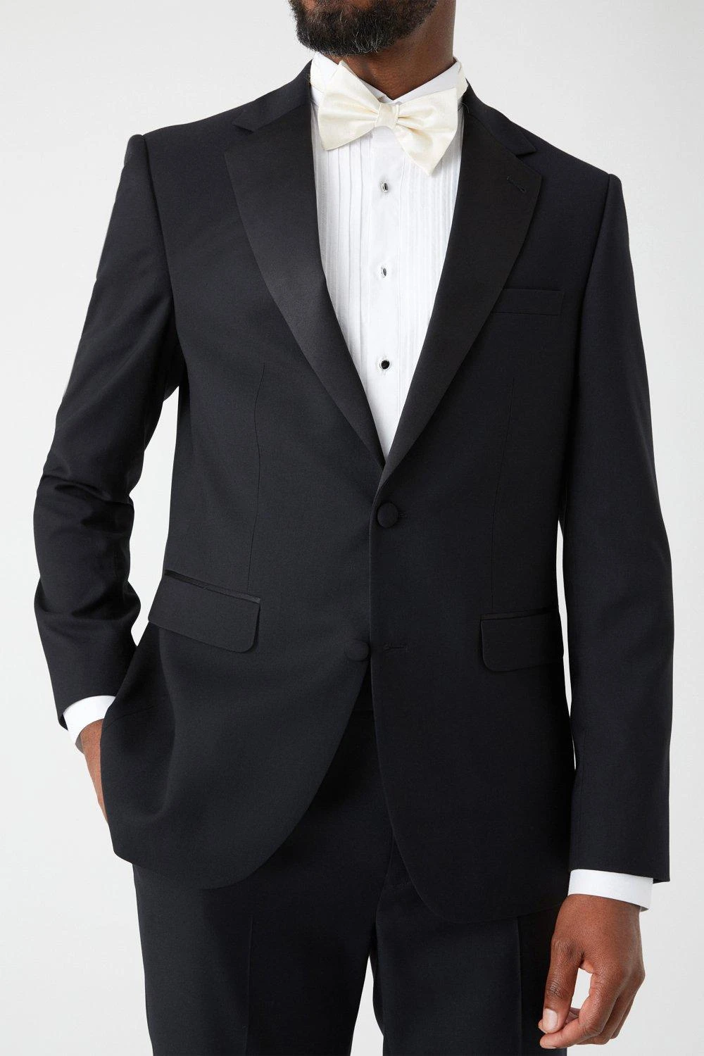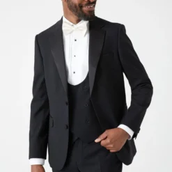 Established back in 1904, we’ve been providing you with great British style and timeless tailoring ever since. Featuring single and double breasted styles as well as classic and modern fits and patterns, our collection of mens suits will keep you on-trend with sharp tailoring, from season to season. Whether you’re suiting up for important meetings or you’ve got a special occasion coming up, we’ve got you sorted. Style: Slim Fit Black Tuxedo Suit Jacket. Ideal for: Smart. Fit: Slim. Design: Plain. Model wears size UK 10 and is 5′ 9″ tall.