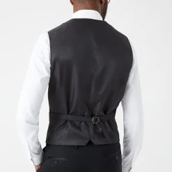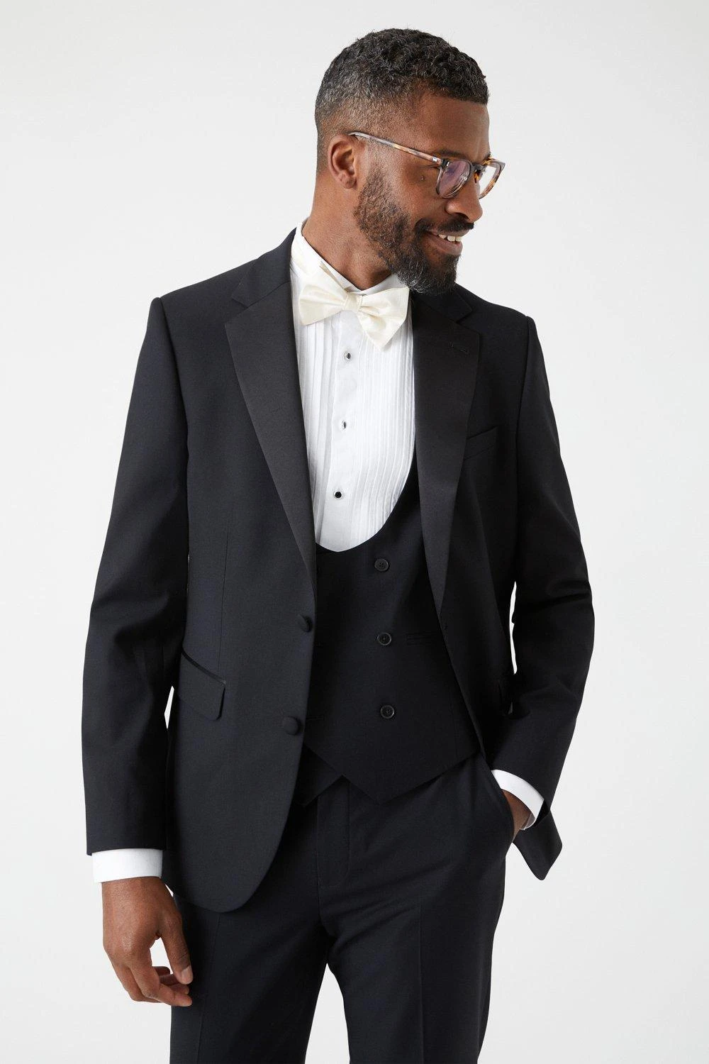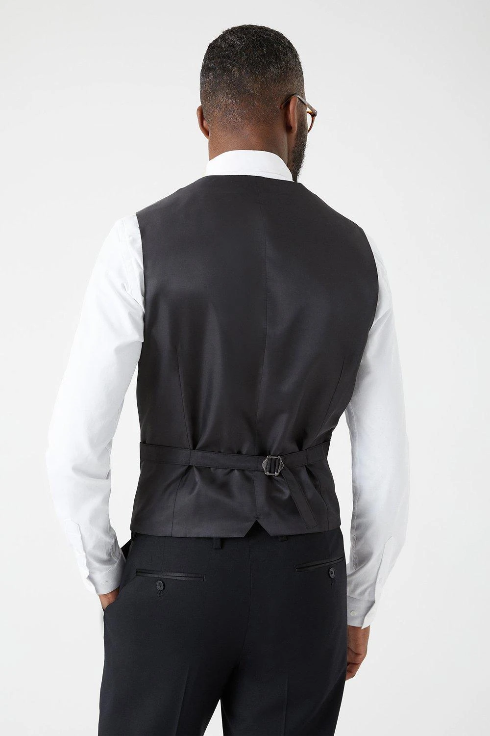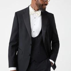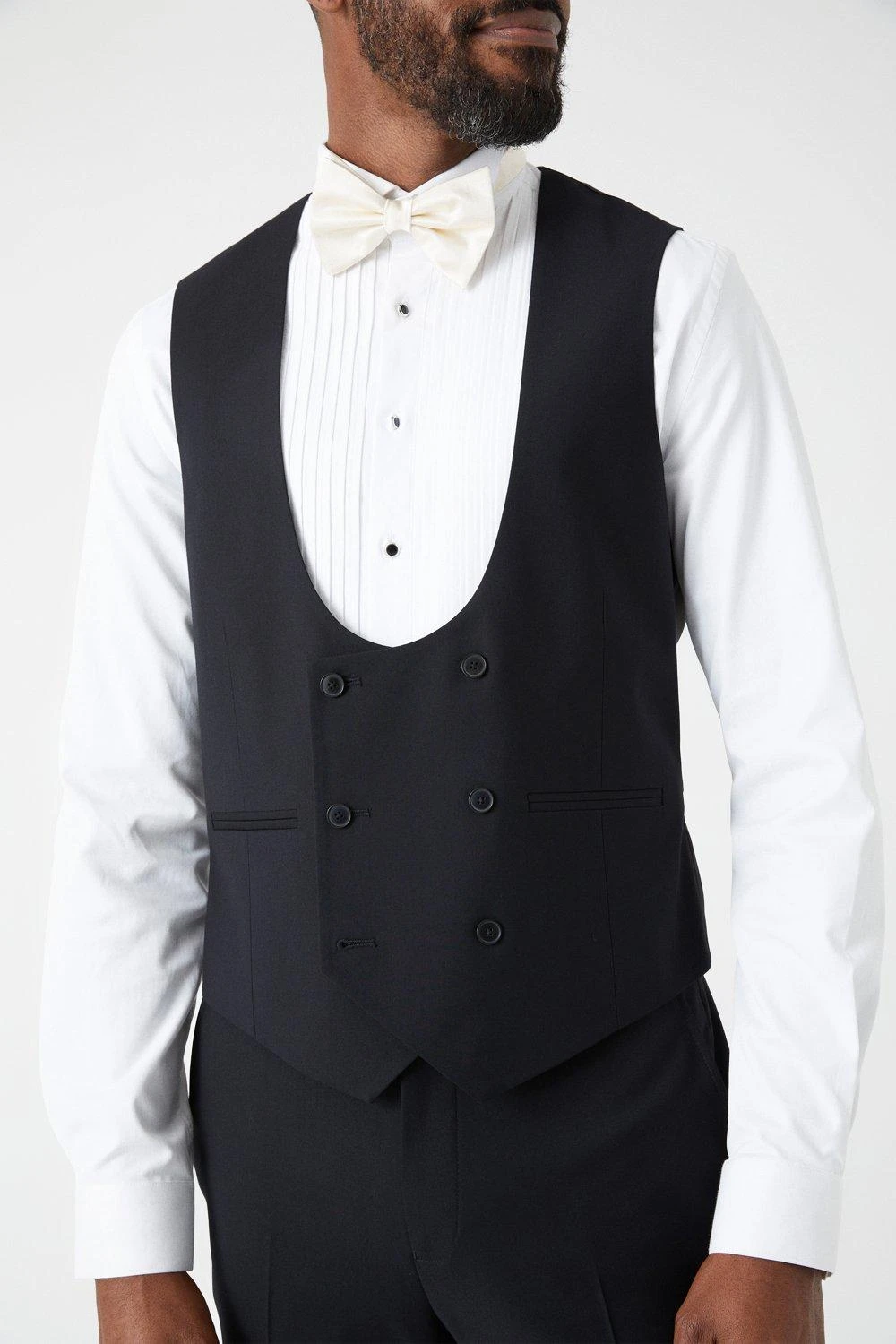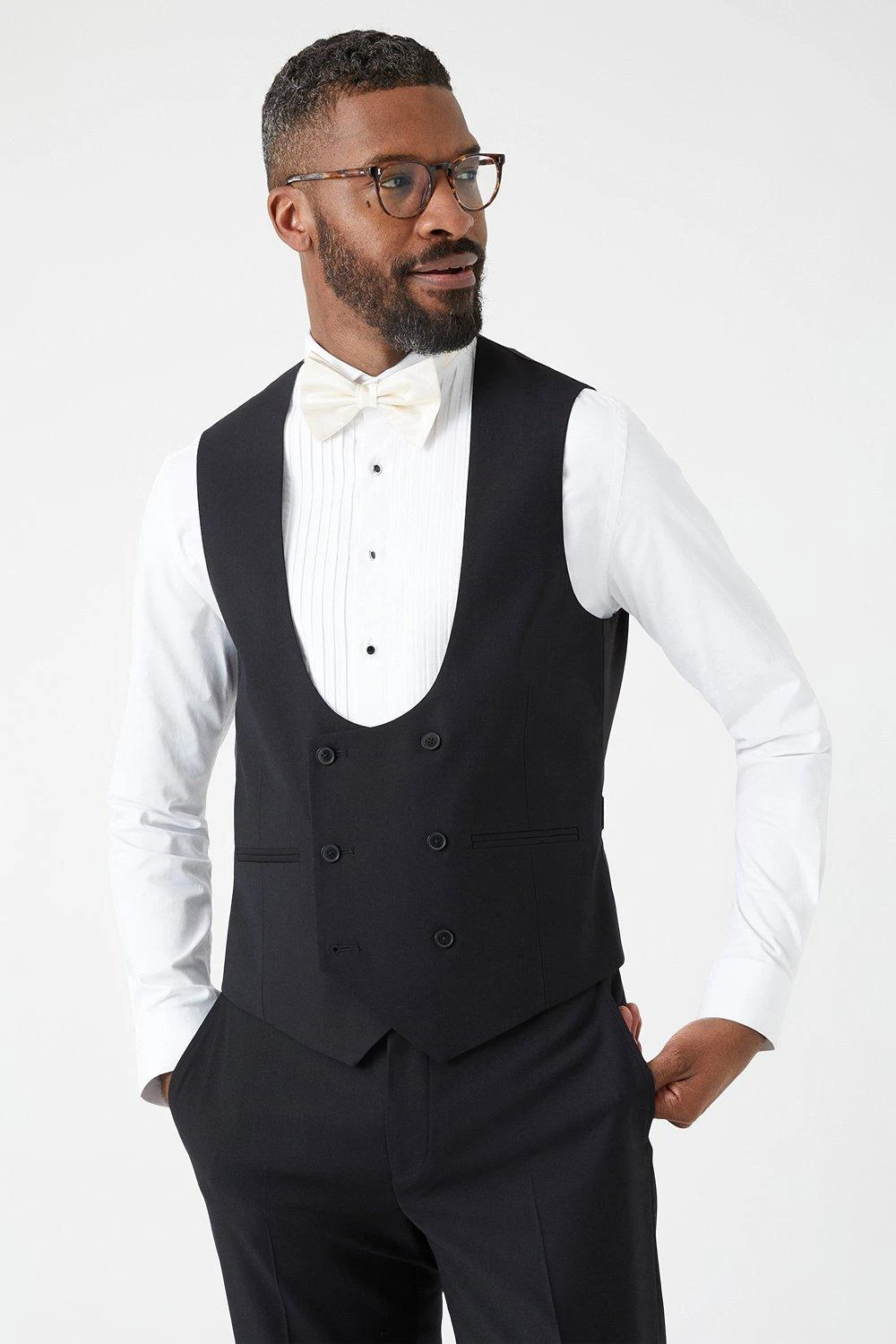Established back in 1904, we’ve been providing you with great British style and timeless tailoring ever since. Featuring single and double breasted styles as well as classic and modern fits and patterns, our collection of mens suits will keep you on-trend with sharp tailoring, from season to season. Whether you’re suiting up for important meetings or you’ve got a special occasion coming up, we’ve got you sorted. Style: Slim Fit Black Tuxedo Suit Waistcoat. Ideal for: Smart. Fit: Slim. Design: Plain. Model wears size UK 10 and is 5′ 9″ tall.
