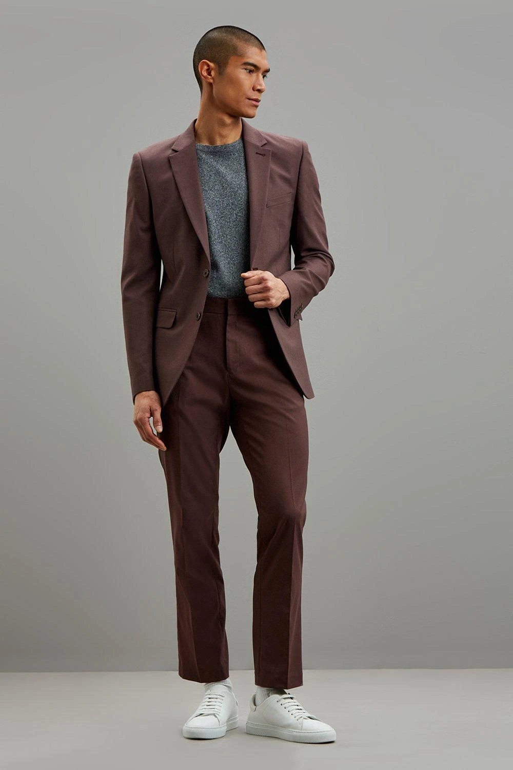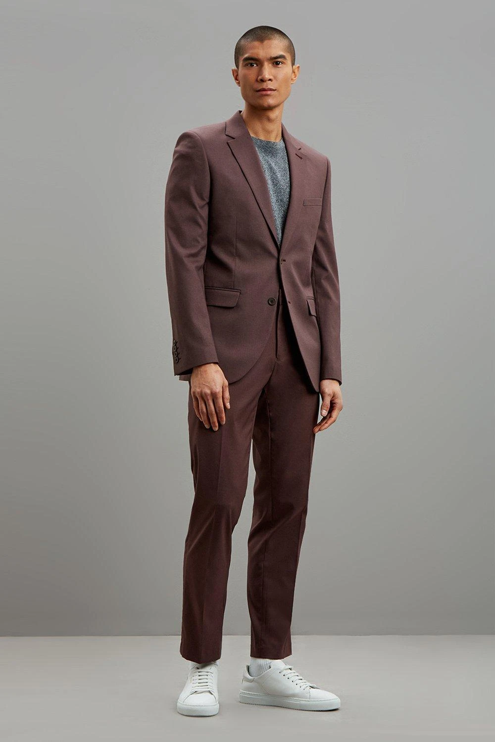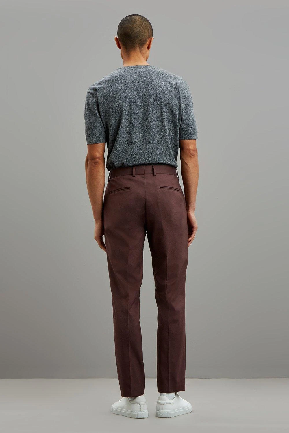 Part of our main range of suits, this suit trouser comes in a peppercorn colourway and a perfect slim fit. Featuring belt loops and functional side pockets. Model is 6 foot 1 and is wearing size 40R.