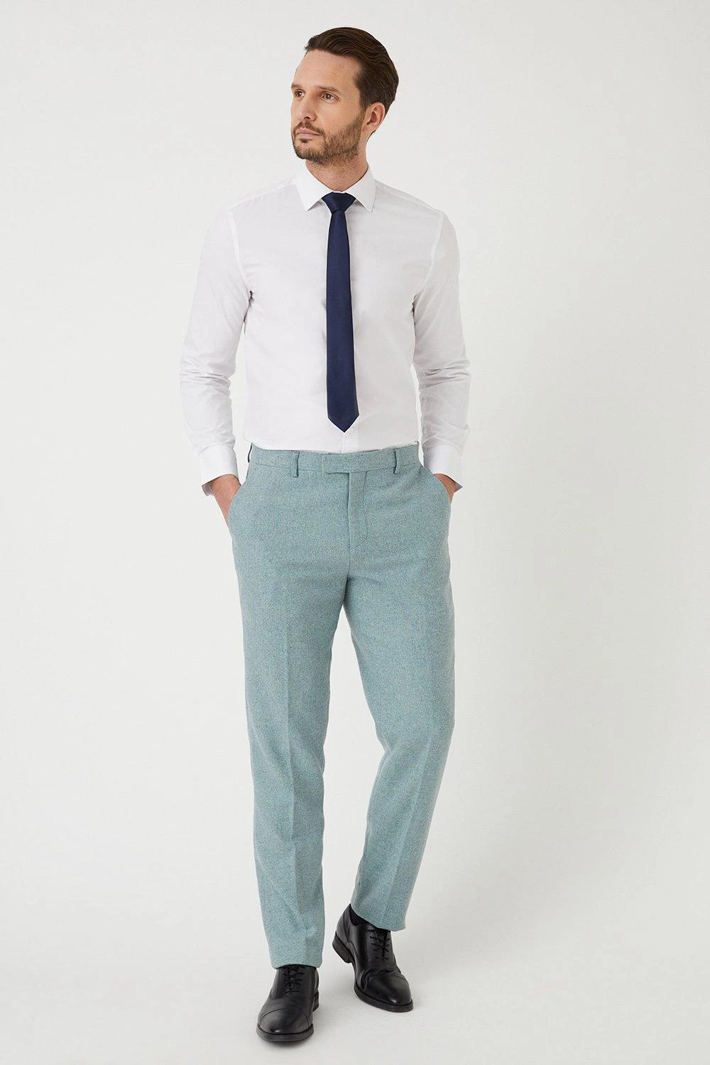Brighten up your suit collection with these light green trousers. Featuring the characteristic flecks and tactile appeal of this unique fabric, this piece comes with a structured waist and tapered leg for a flattering slim fit.Style: Slim Fit Green Tweed Suit TrousersLength: Approx. 78cmFit: SlimIdeal for: SmartDesign: Tweed