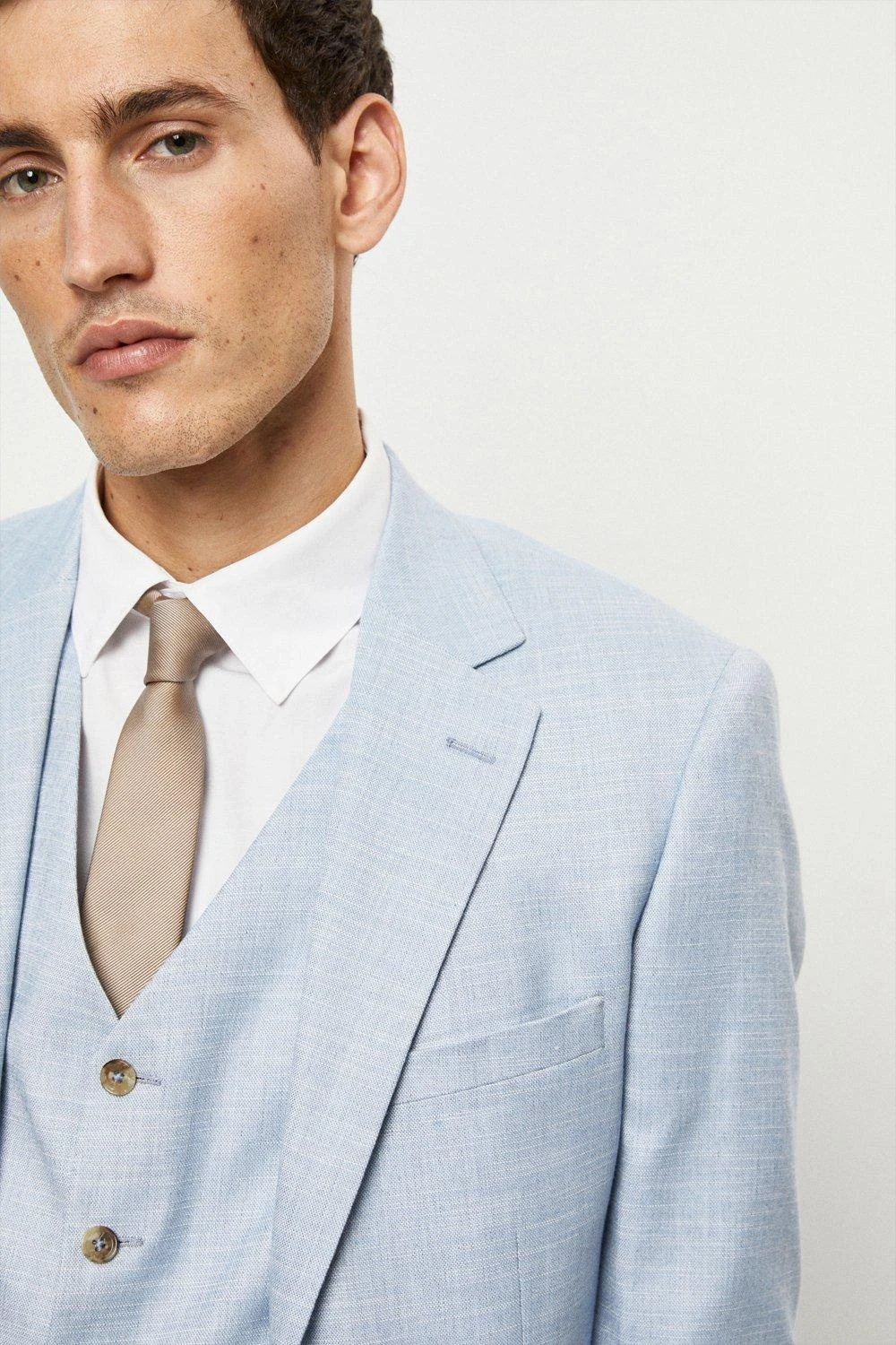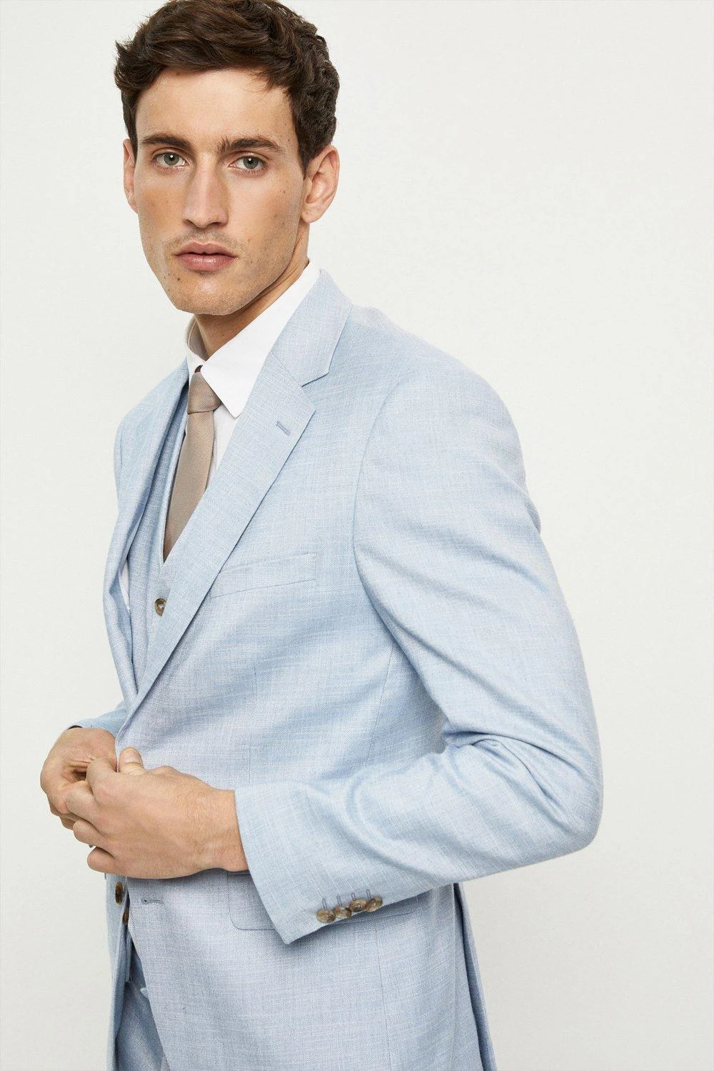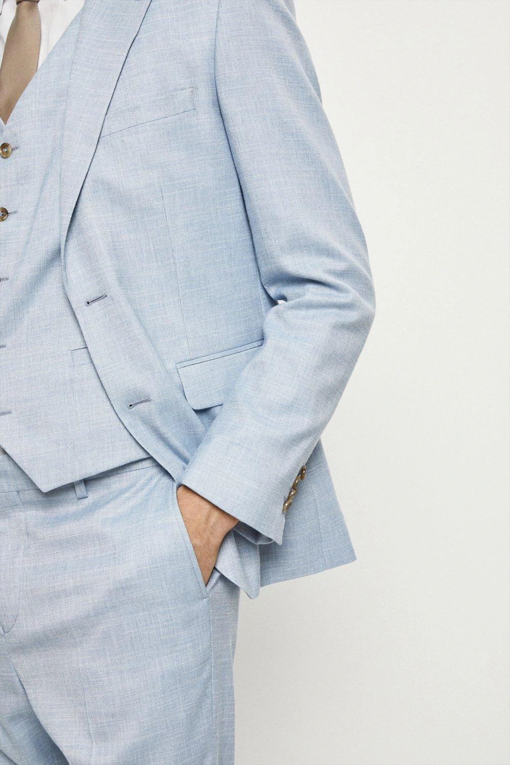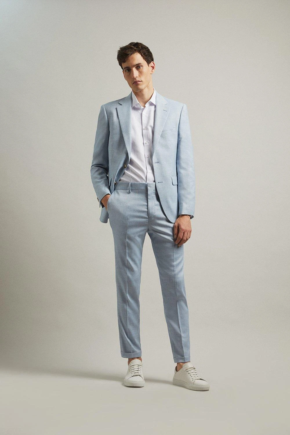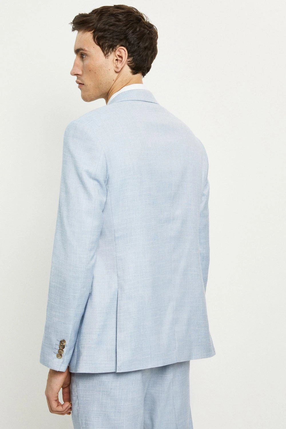 Established back in 1904, we’ve been providing you with great British style and timeless tailoring ever since. Featuring single and double breasted styles as well as classic and modern fits and patterns, our collection of mens suits will keep you on-trend with sharp tailoring, from season to season. Whether you’re suiting up for important meetings or you’ve got a special occasion coming up, we’ve got you sorted. Style: Slim Fit Light Blue Slub Suit Jacket. Ideal for: Smart. Fit: Slim. Design: Single Button. Model wears size UK 10 and is 5′ 9″ tall.
