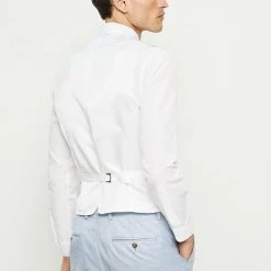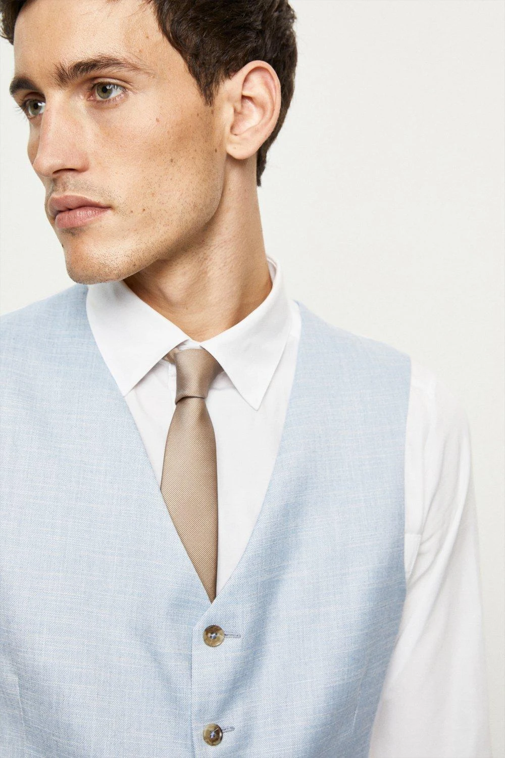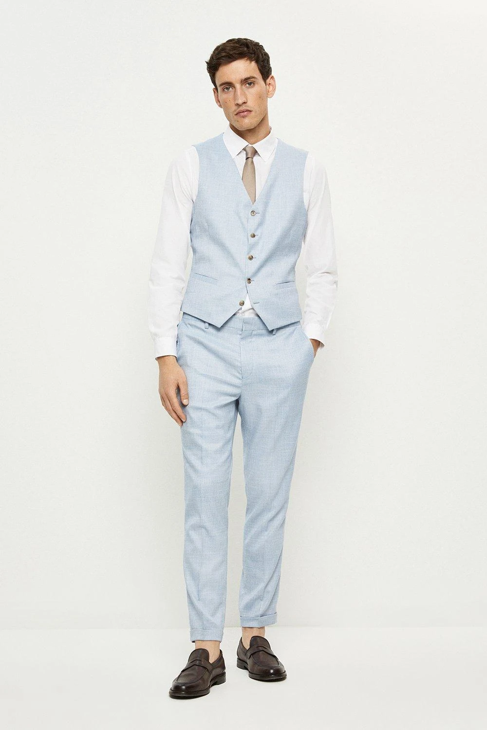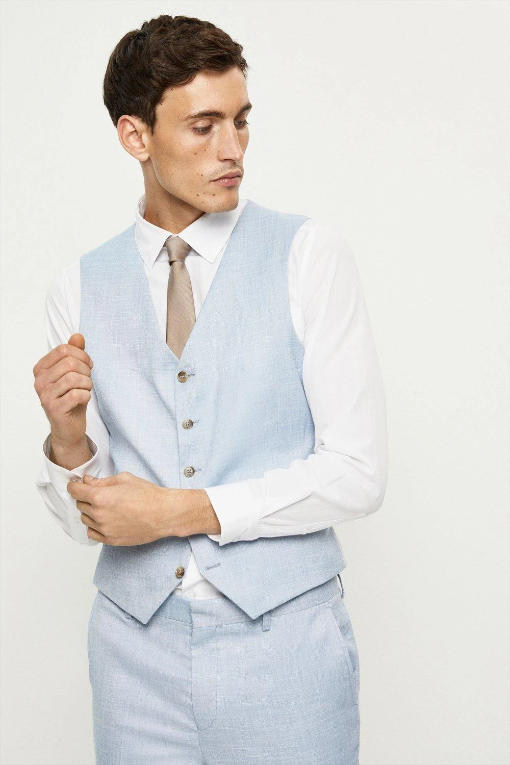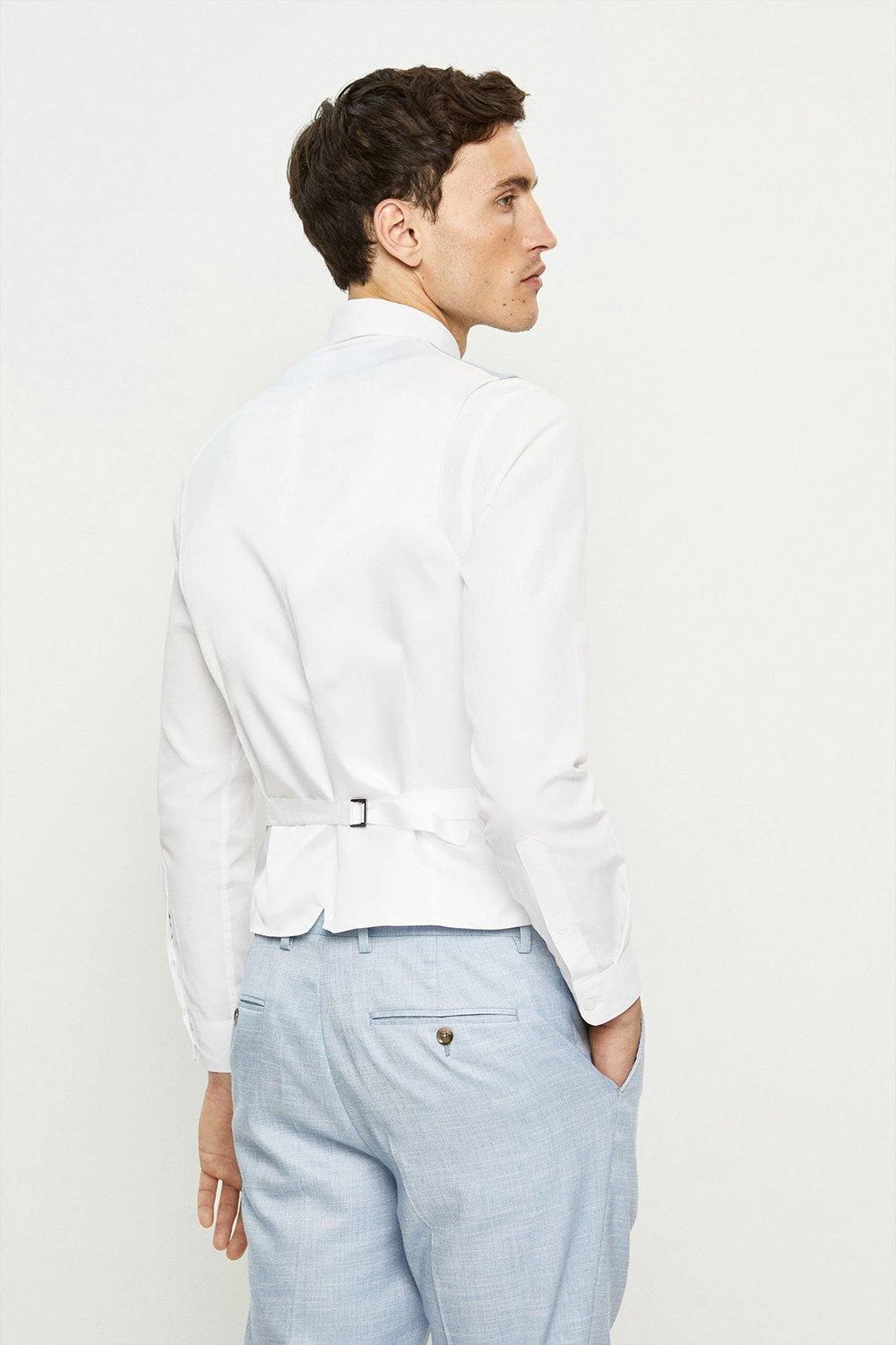 Established back in 1904, we’ve been providing you with great British style and timeless tailoring ever since. Featuring single and double breasted styles as well as classic and modern fits and patterns, our collection of mens suits will keep you on-trend with sharp tailoring, from season to season. Whether you’re suiting up for important meetings or you’ve got a special occasion coming up, we’ve got you sorted. Style: Slim Fit Light Blue Slub Waistcoat. Ideal for: Smart. Fit: Slim. Design: Single Button. Model wears size UK 10 and is 5′ 9″ tall.