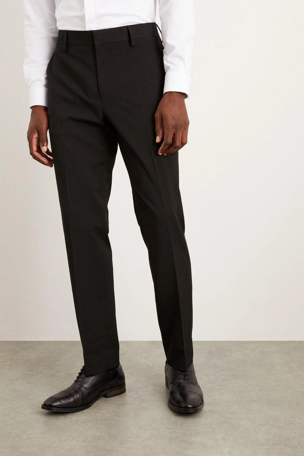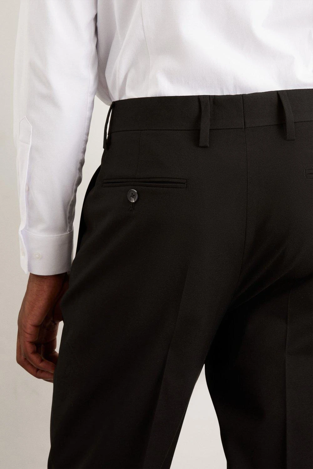 Established back in 1904, we’ve been providing you with great British style and timeless tailoring ever since. Featuring single and double breasted styles as well as classic and modern fits and patterns, our collection of mens suits will keep you on-trend with sharp tailoring, from season to season. Whether you’re suiting up for important meetings or you’ve got a special occasion coming up, we’ve got you sorted. Style: Tailored Fit Black Essential Suit Trousers. Ideal for: Smart. Fit: Tailored. Design: Plain. Model wears size UK 10 and is 5′ 9″ tall. This garment is READY FOR THE FUTURE.Recycled fibres can be used for a number of materials including polyester, cotton and acrylic. They are a more sustainable alternative, as they take less energy, land and water to make than virgin fibres, and are often derived from products that would otherwise have gone to wasteFind out more about our sustainability guidelines and goals.