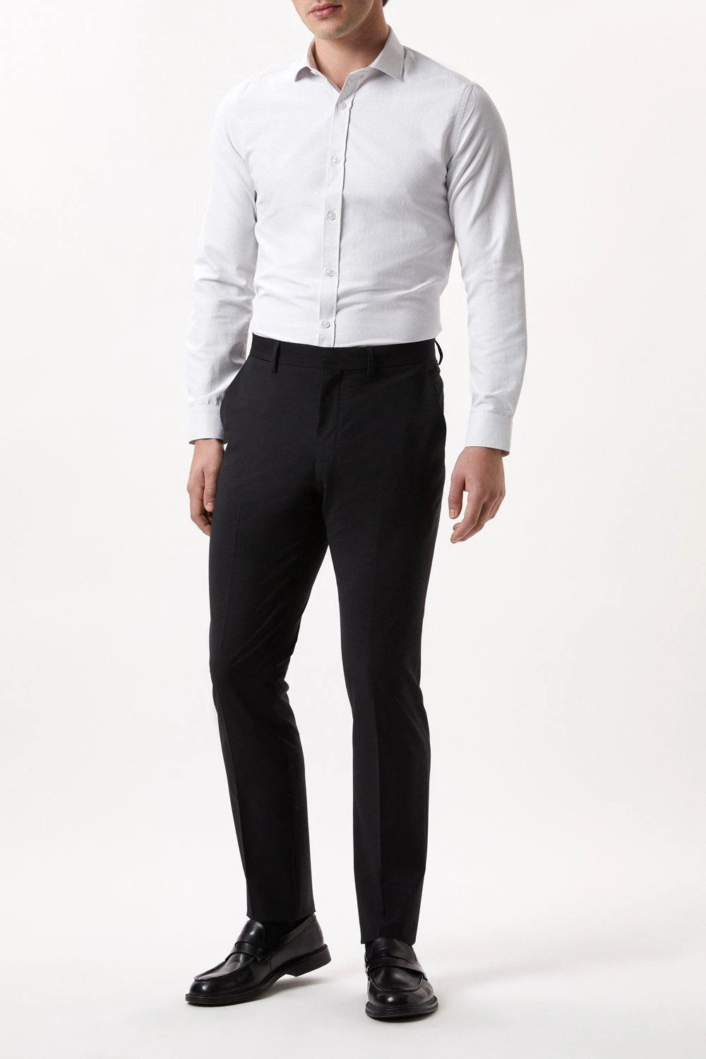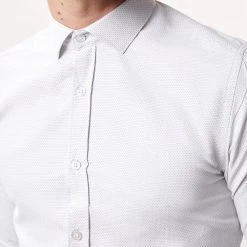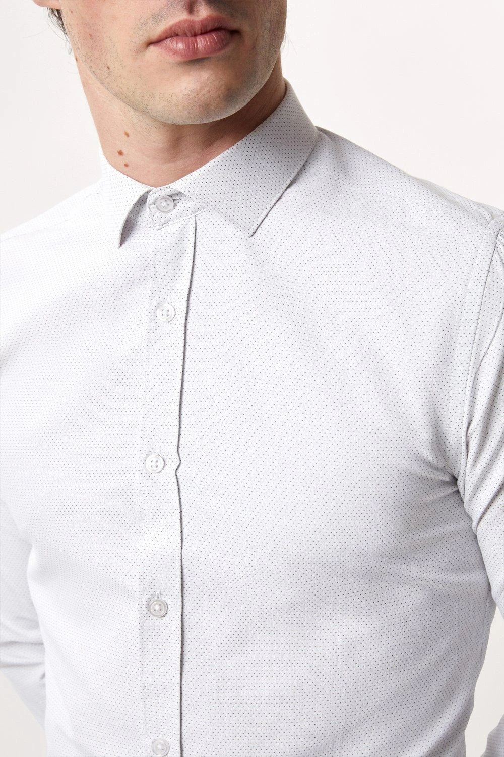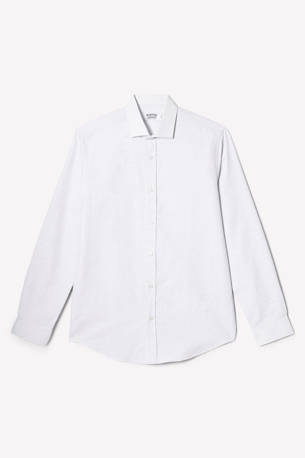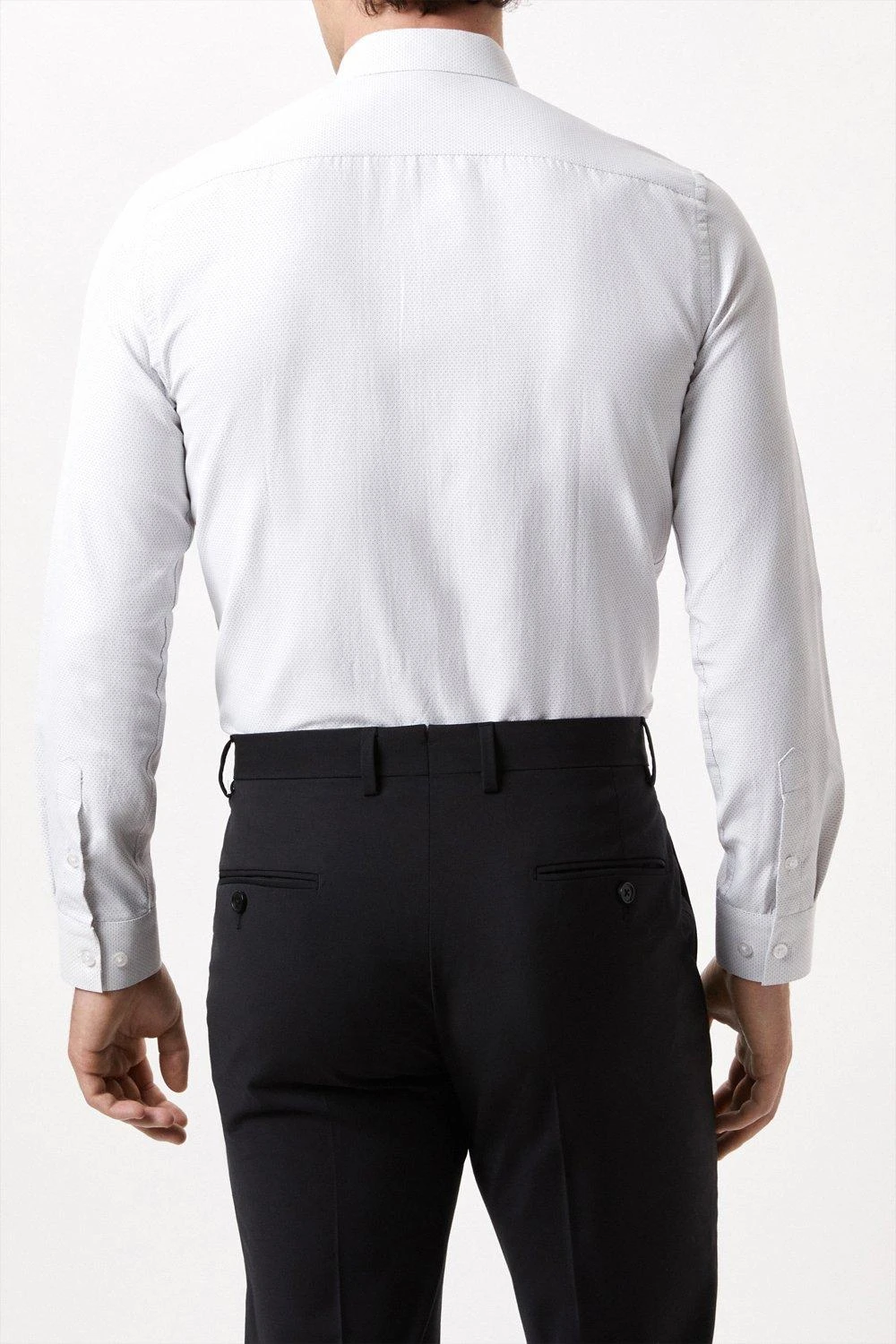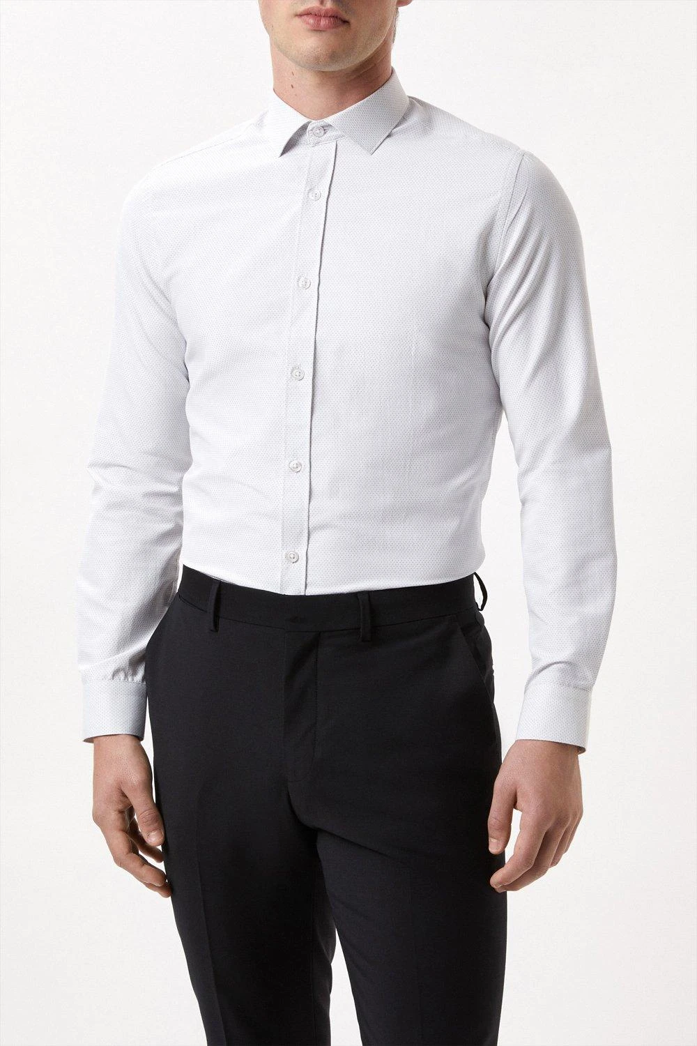 Introducing our new collection of formal fitting shirts, tailored to fit you and available in a range of collar sizes. The slim fit shirt is designed to create definition with a tapered waist, slim silhouette, and curved hem, pairing perfectly with our timeless tailoring. Crafted from a rich cotton blend fabric, it features a classic point collar, single cuff and is finished with dyed- to-match pearl buttons.Style: Long Sleeve White Dobby Spot Point Collar ShirtLength: Approx. 76cmFit: SlimIdeal for: SmartDesign: Collar