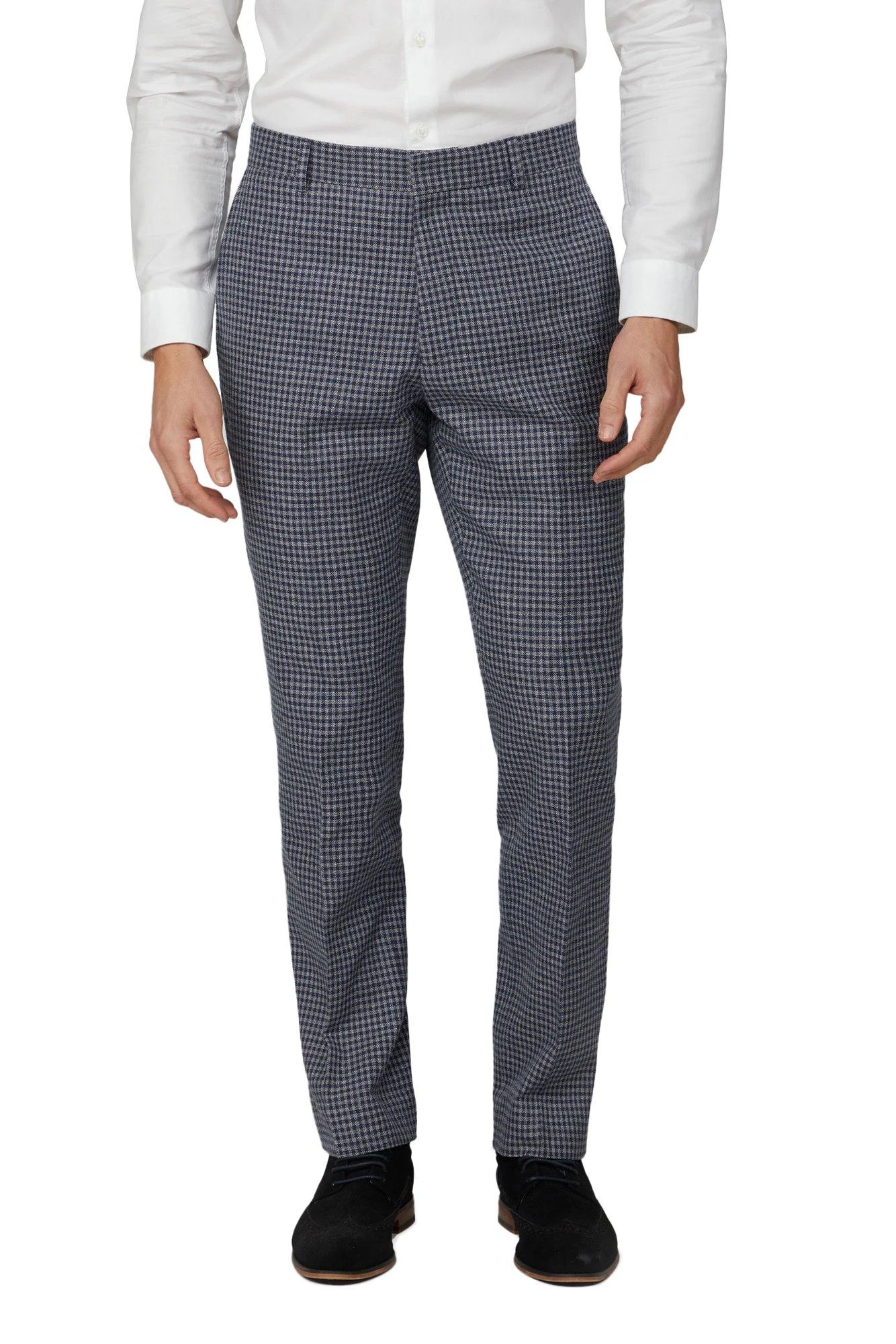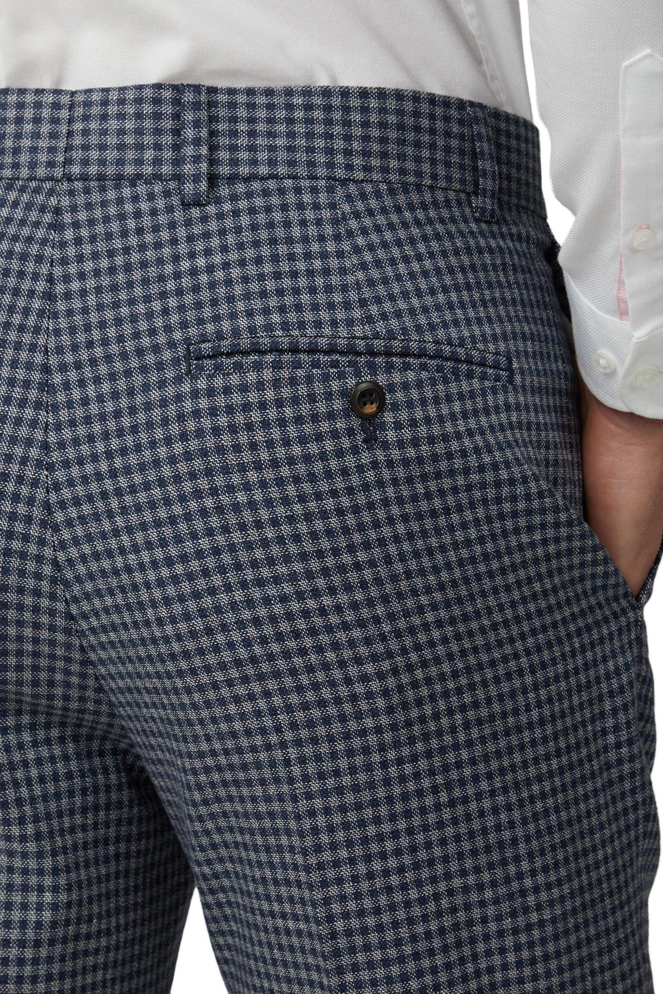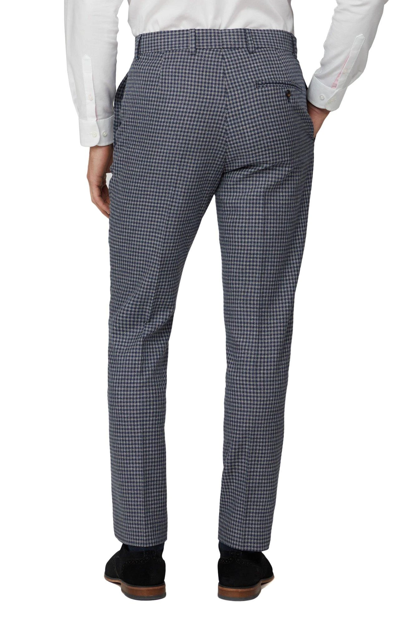 Update your formalwear collection with the ‘Blue grey textured gingham tailored fit trousers’ from Hammond and Co. Inspired by the iconic Savile Row, Hammond & Co suits offer a contemporary take on classic tailoring, making a statement. Hammond & Co harbour the essence of Savile Row tailoring at high street prices. This suit trouser has a plain front with square extension hook and bar fastening. This luxurious wool blend suit trouser offers a premium and stylish aesthetic.