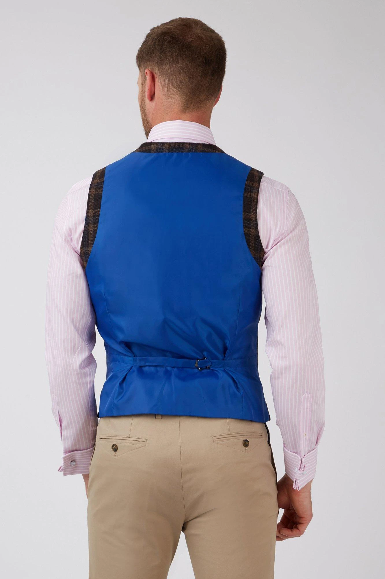 Check Blazer by Jeff Banks. A stylish two button blazer based on the inimitable Jeff Banks Saville Row block. Cut from a soft wool and polyester blended fabric with a myriad of colour hidden in the design. Two patch pockets give a feeling of casual dress. This superb piece of tailoring is half lined in viscose satin to give a lightweight feel. The sleeves are lined with a vintage stripe and punctuated with drafted urea buttons. The cuffs have four different colour buttons reflecting the colour in the complex woven fabric.