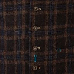 Check Waistcoat by Jeff Banks. A modern six button waistcoat in a complex check pattern wool and polyester fabric. Lined in luxurious satin viscose. The edges handstitched and the six-button fastening created with crafted urea buttons.