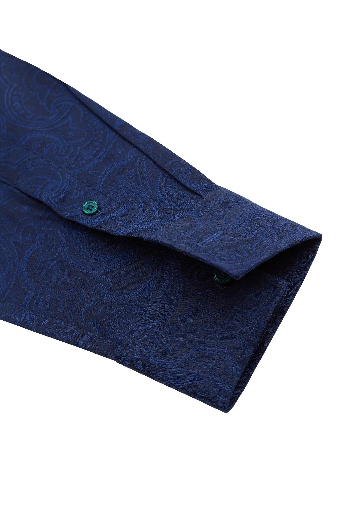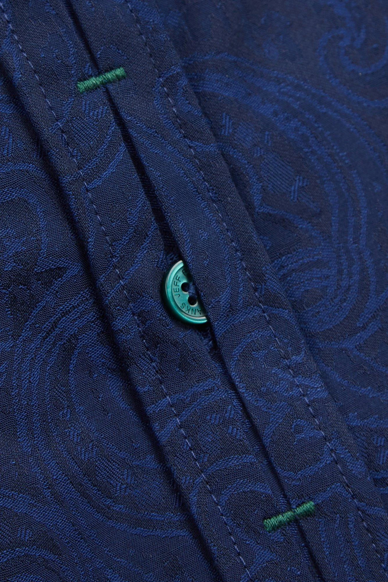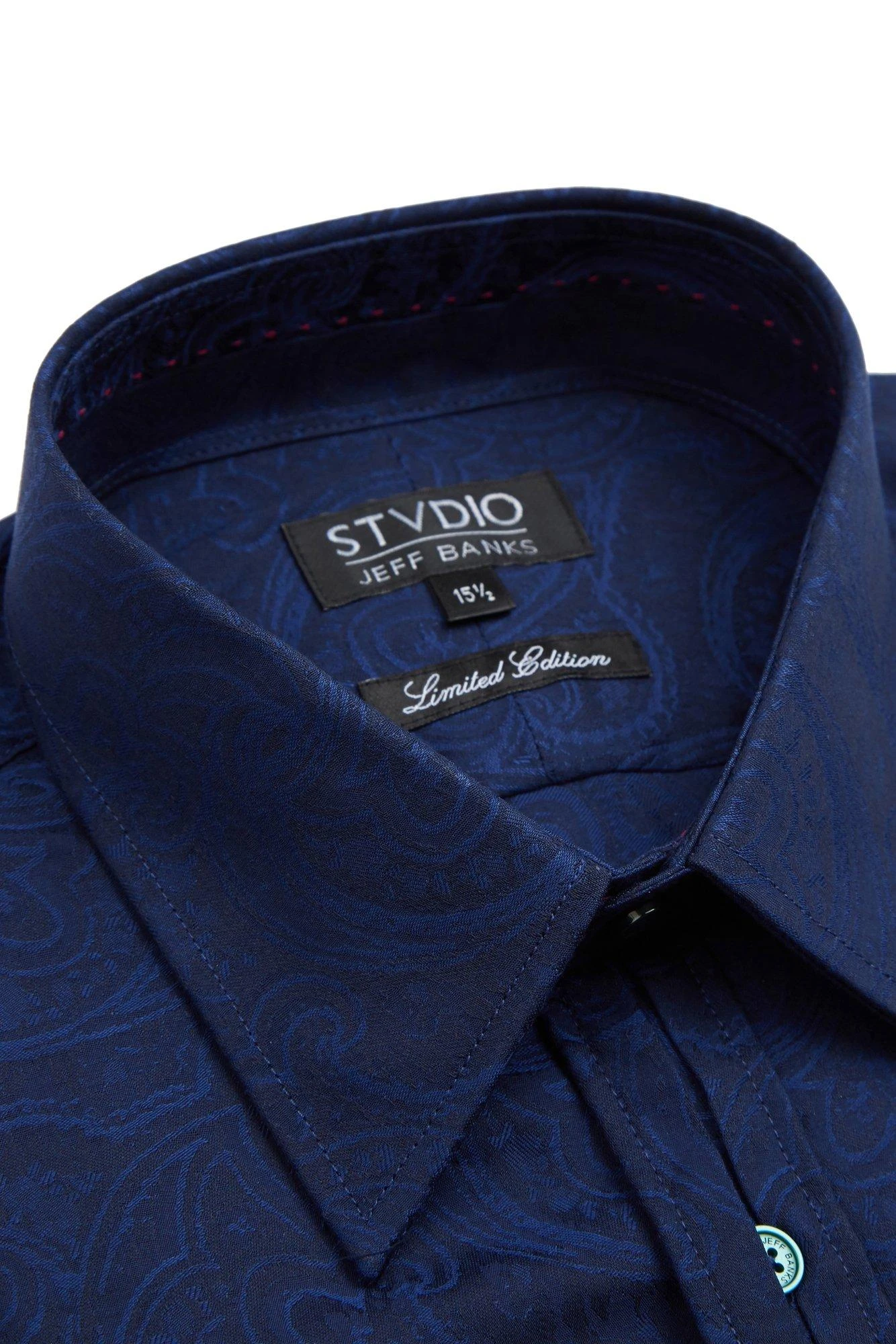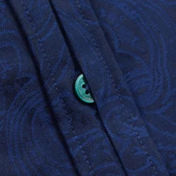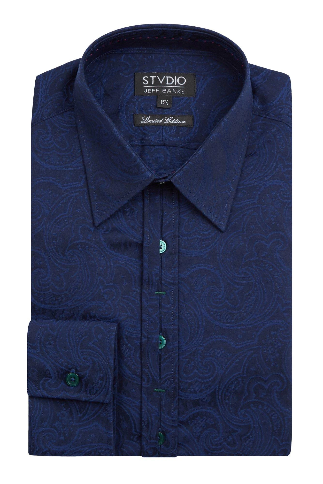 A smart, formal shirt for men by Jeff Banks STVDIO – with 100% cotton fabric and a forward point collar in a classic men’s jacquard shirt. A bright blue formal cotton shirt in a slim fit, double cuffs and an under placket construction, with Jeff Banks branding and a versatile jacquard print.