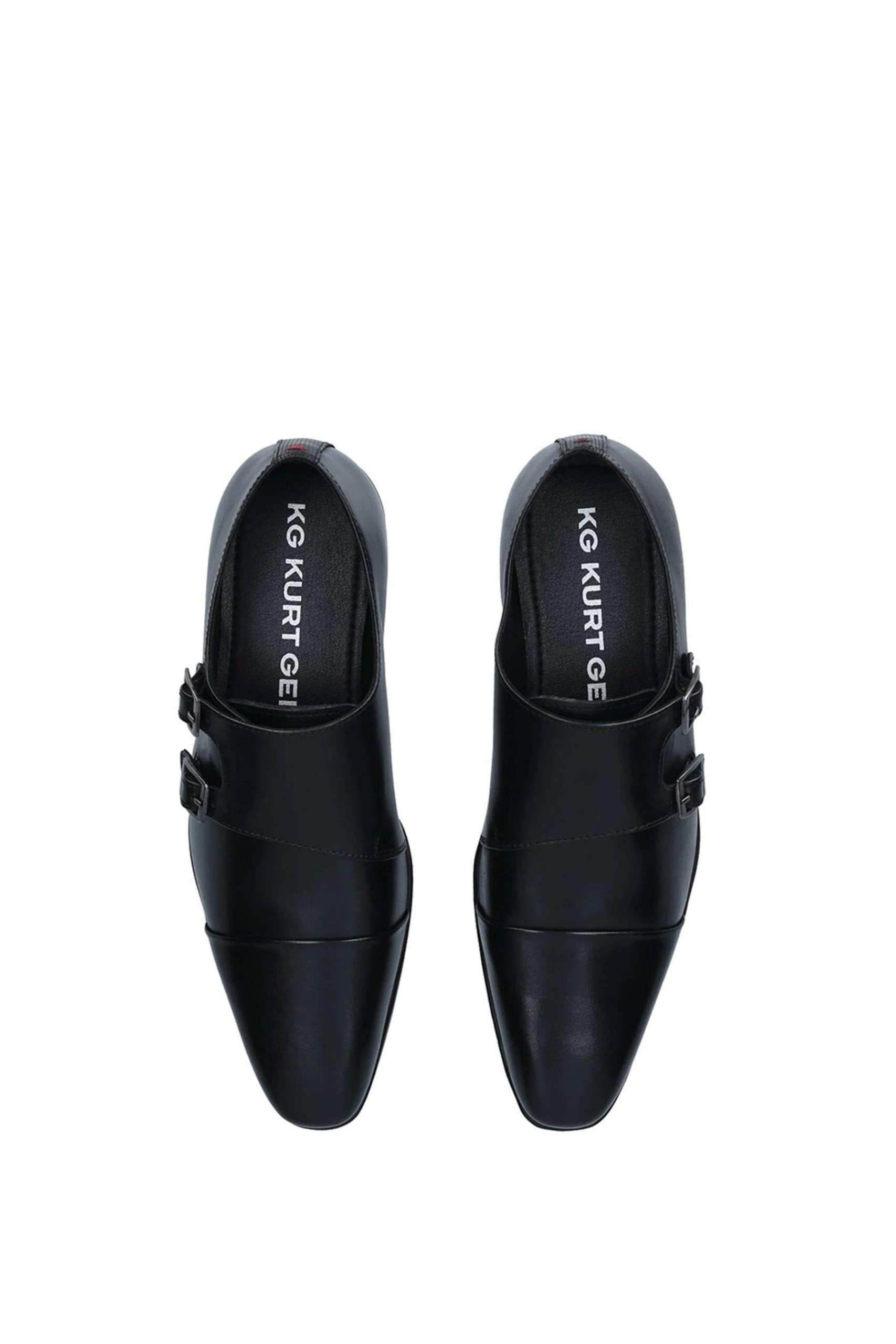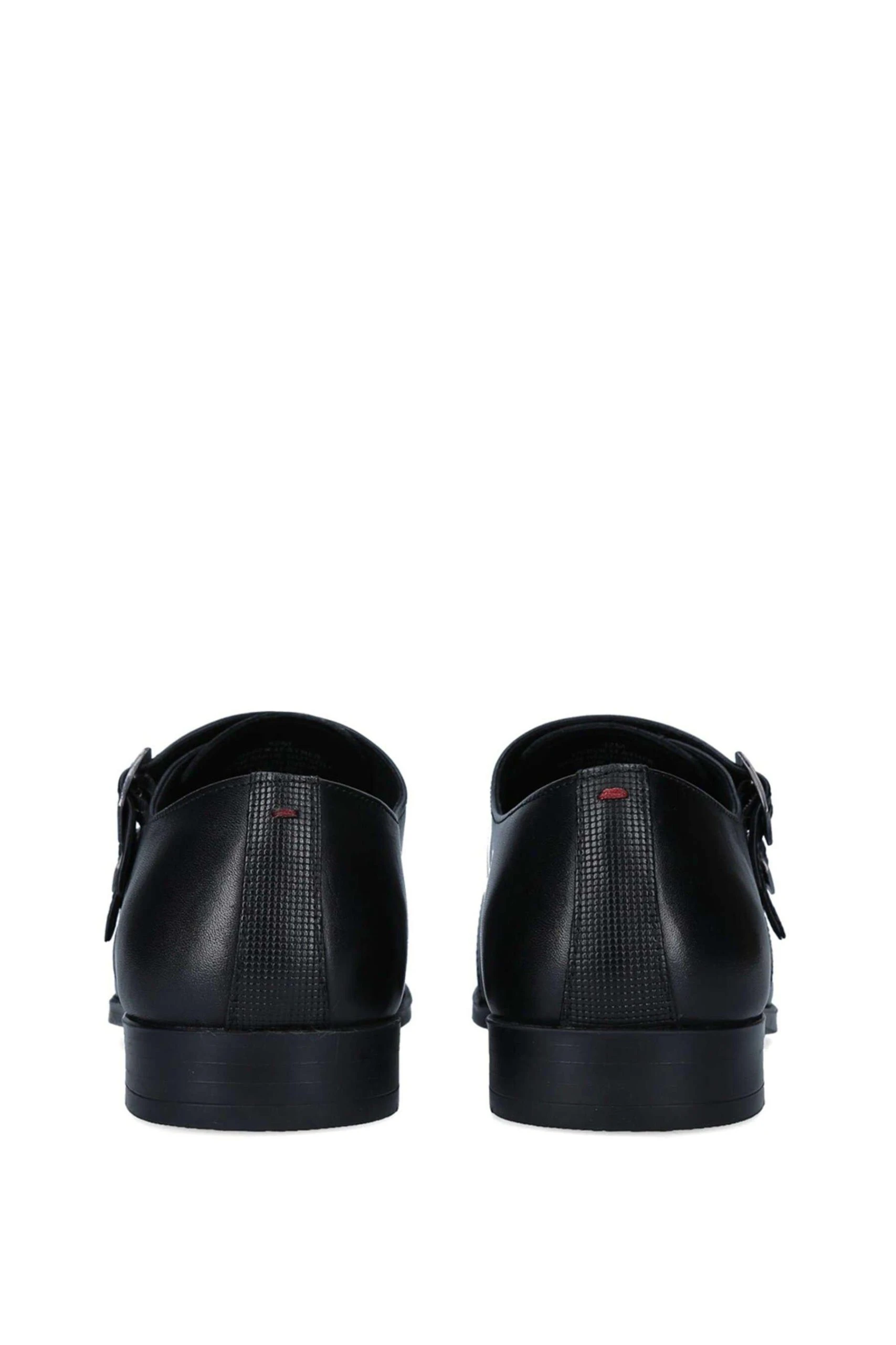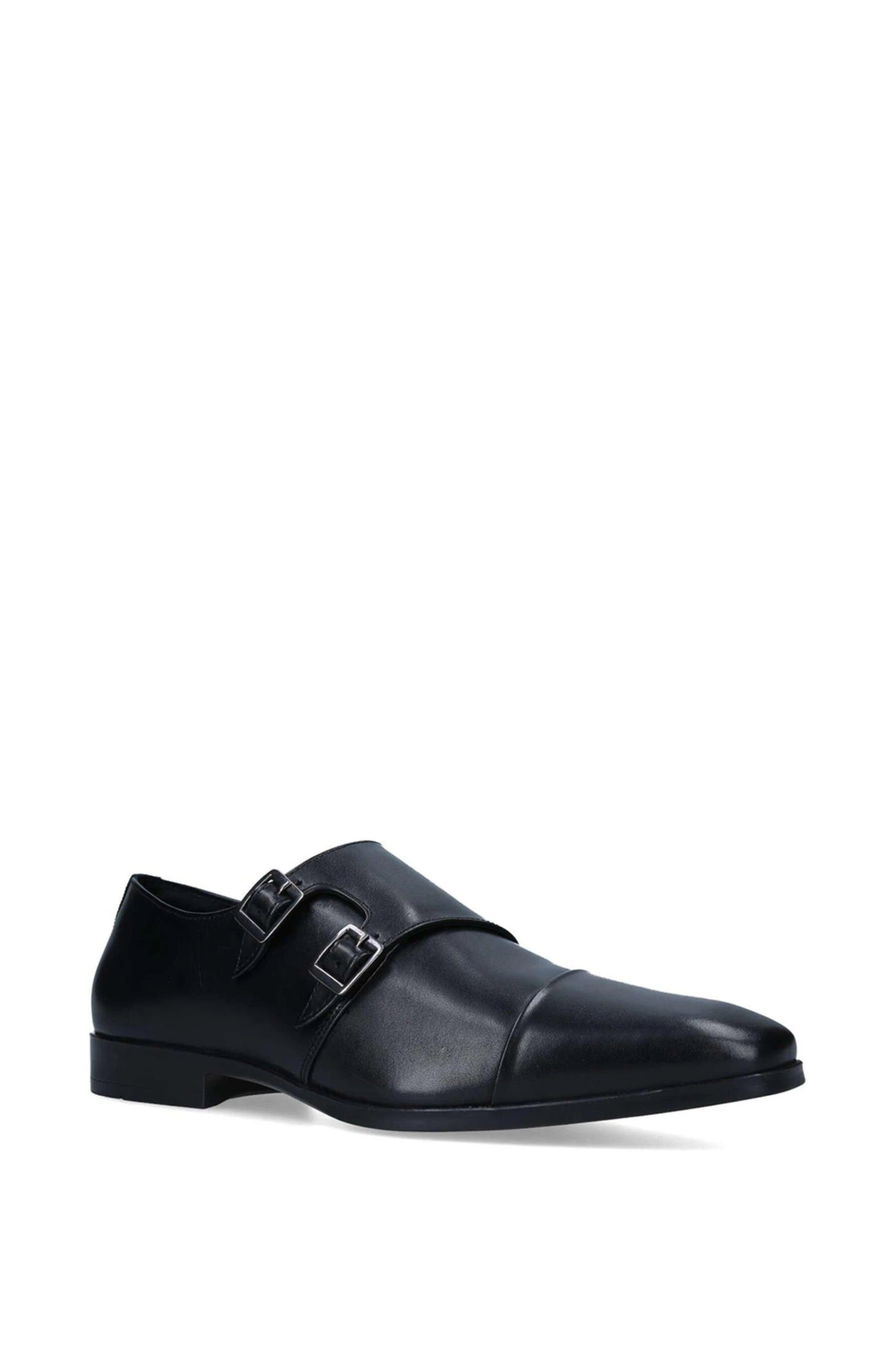 The monk style Collins formal shoe is crafted from a black smooth leather. The front features two buckled straps across the front of the shoe with a raised stitch toecap detail. The heel has a slight elevation.