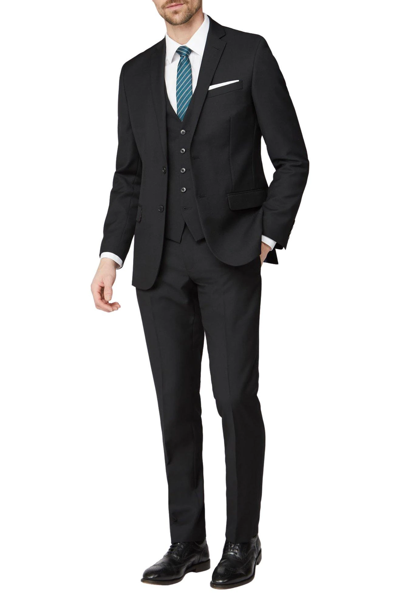 Black textured tailored fit trouser from the Racing Green Collection. Make this your go-to suit for the office or those wedding invitations. The lightweight fabric is perfect for the summer transitioning into the seasons beyond – make a lasting impression all year round. Pair with the matching jacket for the full look.